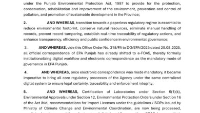 ادارہ تحفظ ماحول پنجاب کا بڑا انتظامی فیصلہ، تمام ماحولیاتی منظوریوں، لیبارٹری سرٹیفکیشن اور پروٹیکشن آرڈرز کا اجرا اب صرف ڈیجیٹل نظام…
