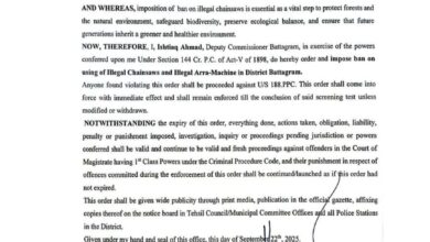 ڈپٹی کمشنر بٹگرام اشتیاق احمد نے ضلع بٹگرام کی حدود میں جنگلات کی غیر قانونی کٹائی پر دفعہ 144 نافذ کر دی