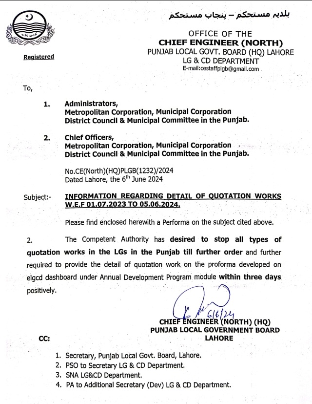 محکمہ لوکل گورنمنٹ اینڈ کمیونٹی ڈویلپمنٹ کے چیف انجینئر کا انوکھا کارنامہ عید الاضحٰی سے قبل اور پری مون سون کے دوران کوٹیشن کے کاموں کی تمام اقسام پر پابندی لگا دی ہے۔پنجاب کے 229 بلدیاتی اداروں اور ایل جی اینڈ سی ڈی کے تمام دفاتر میں معمول کے روزمرہ کے کام بھی رک گئے۔چیف انجینئر ہیڈ کوارٹر پنجاب لوکل گورنمنٹ بورڈ کی طرف سے لیٹر جاری ہونے کے بعد عیدالاضحٰی پر روزانہ کی بنیاد پر ہونے والے کام،انتظامات، خریداری، اخراجات ،ادائیگیاں وغیرہ رک گئی ہیں۔پنجاب کے بلدیاتی ادارے اس پابندی کے بعد بجٹ سے جھاڑو تک نہیں خرید سکتے۔ایڈمنسٹریٹرز اور چیف افسران کے صوابدیدی اختیارات بھی اس اہم موقع پر ختم کر دیئے گئے ہیں۔جس سے عیدالاضحٰی کے حوالے سے ستھرا پنجاب پروگرام، آگاہی مہم سمیت تمام انتظامی اور مالی امور ٹھپ ہو گئے ہیں۔جن میں قربانی کے جانوروں کا فضلہ ٹھکانے لگانے کے لئے گاڑیاں کرائے پر حاصل کرنے کے حوالے سے بھی بلدیاتی افسران پریشان ہیں۔پری مون سون میں ہنگامی بنیادوں پر انتظامات بھی متاثر ہوئے ہیں۔چیف انجینئر کی طرف سے سالانہ ترقیاتی پروگرام کے تحت بلدیاتی اداروں کوٹیشن کے کام کی تفصیلات تین روز میں فراہم کرنے کا بھی حکم دیا گیا ہے۔یہ مراسلہ میٹروپولیٹن کارپوریشن لاہور، میونسپل کارپوریشنز، ضلع کونسلوں اور میونسپل کمیٹیوں کے ایڈمنسٹریٹرز اور چیف افسران کے نام جاری کیا گیا ہے۔محکمہ بلدیات کی جانب سے اوپرتلے حماقتوں پر بلدیاتی افسران حیران بھی اور پریشان بھی ہیں۔کوٹیشن ورکس پر پابندی آئندہ احکامات تک برقرار رہے گی۔