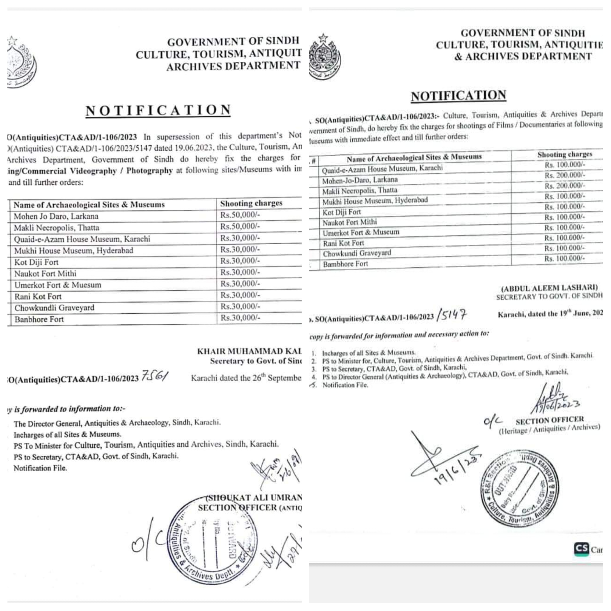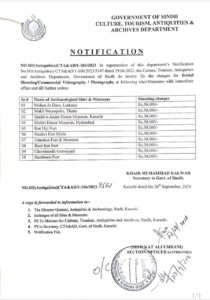 موہن جو دڑو لاڑکانہ، مکلی کی 2 لاکھ روپے سے فیس کم کرکے 50 ہزار روپے کردی گئی ہے۔قائد اعظم ہاؤس میوزیم کی ایک لاکھ روپے سے کم کرکے فیس 30 ہزار روپے مقرر،مکھی ہاؤس میوزیم حیدرآباد، کوٹڈجی قلعہ، نوکوٹ قلعہ کی فیس ایک لاکھ سے کم کرکے 30 ہزار روپے مقرر کردی گئی ہے۔عمرکوٹ قلعہ و میوزیم، رنی کوٹ قلعہ، چوکنڈی قبرستان، بھنبھور قلعہ کی نئی فیس 30 ہزار روپے مقرر کی گئی ہے۔سیکرٹری کلچر کی جانب سے نئی قیمتوں کا نوٹیفیکیشن جاری کیا گیا ہے۔فیسز کم کرنے سے زیادہ سے زیادہ لوگ اس سے مستفید ہونگے، سید ذوالفقار علی شاہ صوبائی وزیر کا مزید کہنا ہے کہ قیمتیں کم کرنے سے سیاحتی مقامات مزید اجاگر ہونگے۔وزیراعلیٰ سندھ کی واضع ہدایات ہیں کہ سیاحتی، ثقافتی مقامات کے ذریعے سندھ کا مثبت چہرہ دنیا تک جانا چاہیے۔
