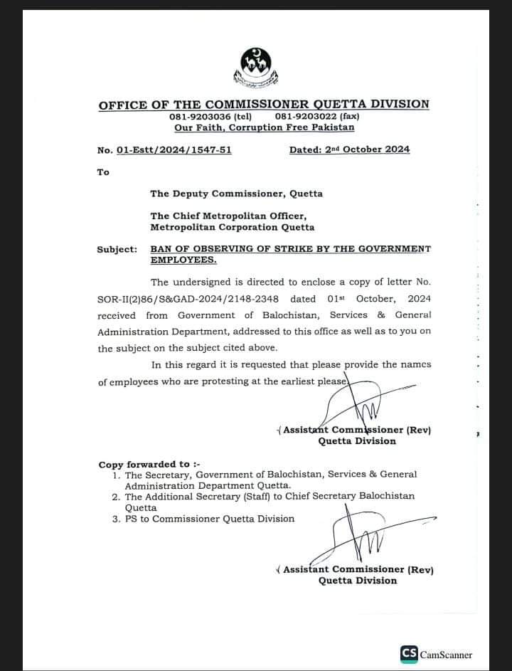کمشنر کوئٹہ ڈویژن کے دفتر سے جاری ہونے والے ایک سرکلر کے مطابق محکمہ ایس اینڈ جی اے ڈی کے ایک اعلامیہ میں کہا گیا کہ بلوچستان ہائی کورٹ نے مورخہ 10 ستمبر 2024 کے سی پی نمبر 843/2023 کے حکم کے ذریعے تمام سرکاری ملازمین کو واضح طور پر ہدایت کی ہے کہ وہ سول سیکرٹریٹ یا شہر کا کوئی دوسرا راستہ پر، کسی بھی قسم کے جلوس، ہڑتال یا دھرنا سے گریز کریں۔ اس سلسلے میں ڈپٹی کمشنر کوئٹہ حکم کی تعمیل کریں، جس کے تحت دفتری اوقات میں مخصوص مقامات/پوائنٹس کو ایسے کسی مقصد کے لیے مختص اور شناخت نہ کرائیں۔تمام متعلقہ افراد کو ہدایت کی جاتی ہے کہ وہ عدالت عظمیٰ کے احکامات پر من و عن عمل کریں۔اس سلسلے میں ڈپٹی کمشنر کوئٹہ، چیف میٹروپولیٹن آفیسر، میٹروپولیٹن کارپوریشن کوئٹہ سے درخواست ہے کہ سرکاری ملازمین کی ہڑتال پر پابندی پر عملدرآمد کراتے ہوئے ان ملازمین کے نام جلد از جلد فراہم کریں جو احتجاج کر رہے ہیں۔