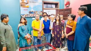 مہمانوں پر پھولوں کی پتیاں نچھاور کی گئیں، بعد ازاں کانفرنس ھال میں منعقدہ استقبالیہ تقریب میں صدر اور سیکرٹری نیشنل پریس کلب کو سندھی اجرک پہنائی گئی ۔