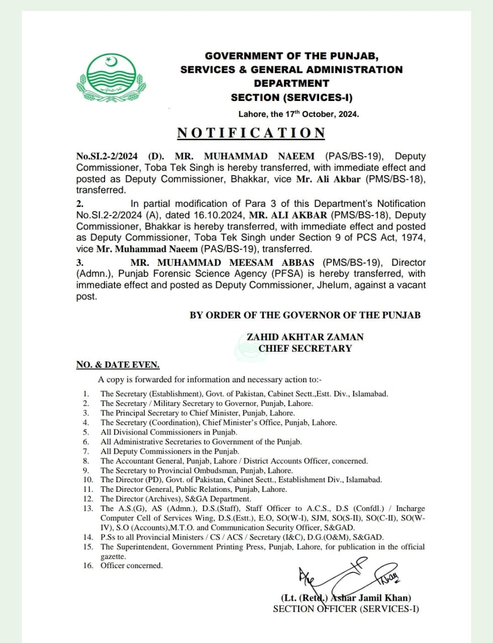 پنجاب میں بڑے پیمانے پرتقرروتبادلے،اسد اللہ تبدیل،خرم پرویز چیف ایگزیکٹو آفیسر پنجاب رورل میونسپل سروسز کمپنی تعینات