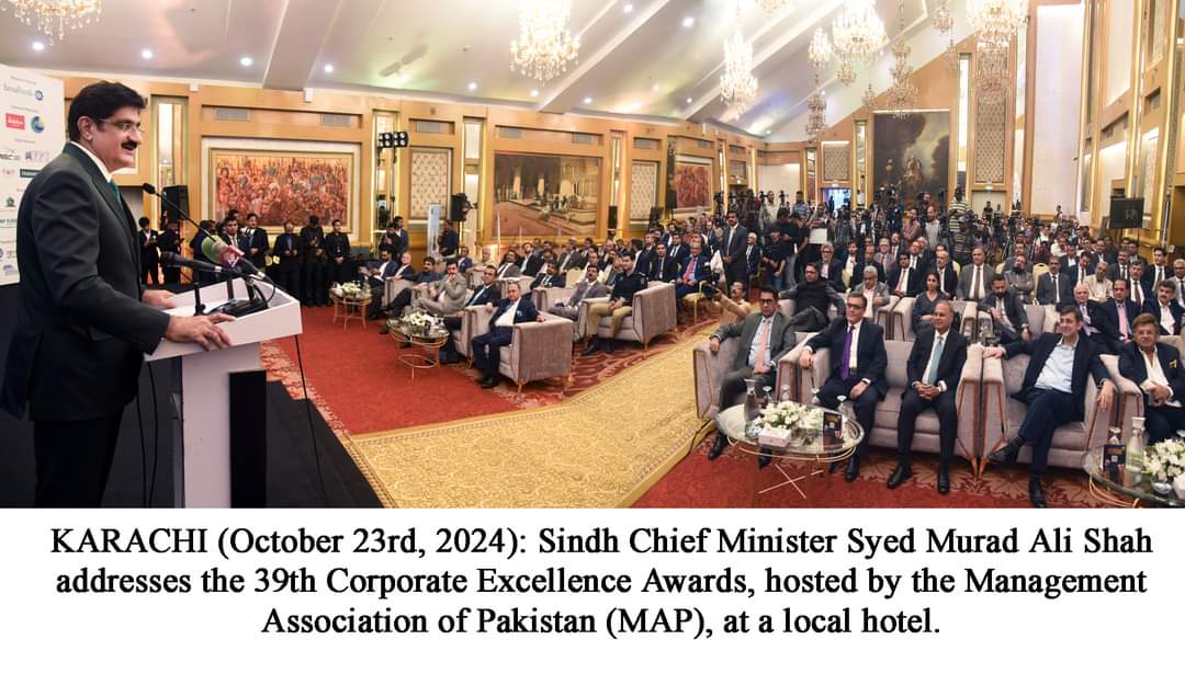 انہوں نے یہ بات مقامی ہوٹل میں مینجمنٹ ایسوسی ایشن آف پاکستان (میپ) کے تحت 39ویں کارپوریٹ ایکسی لینس ایوارڈز کی تقریب سے خطاب کرتے ہوئے کہی۔ سینیٹر سرمد علی خان نے پروگرام میں وزیراعلیٰ کو خوش آمدید کہا۔