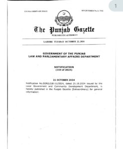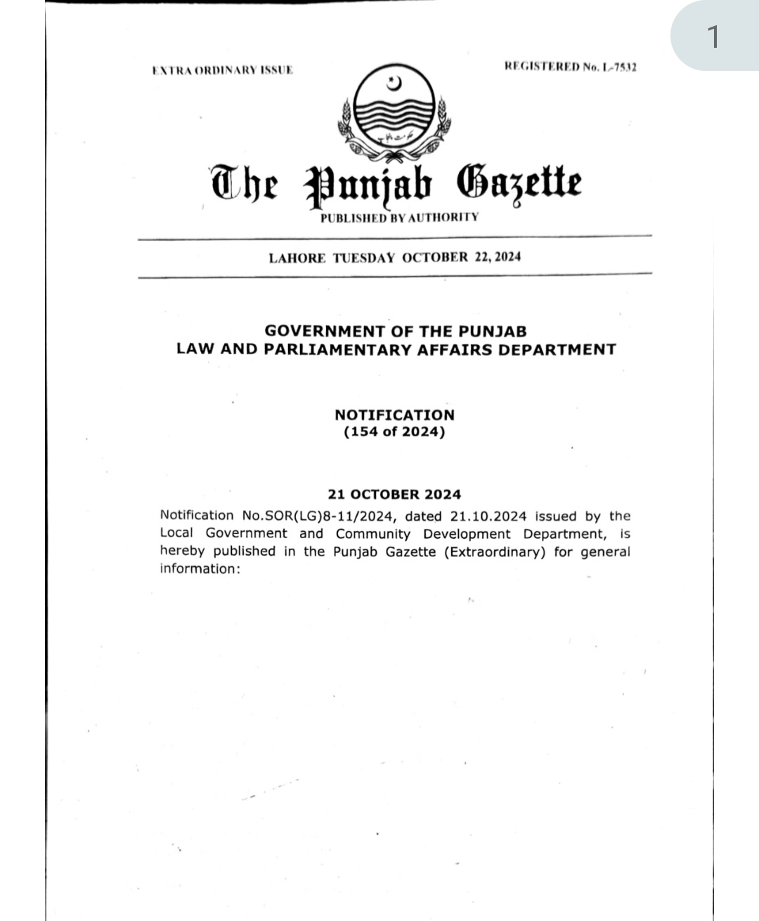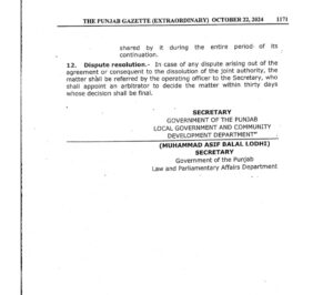 محکمہ بلدیات پنجاب نے لوکل گورنمنٹ جوائنٹ اتھارٹی رولز 2024 کا گزٹ نوٹیفکیشن جاری کر دیا ہے۔سیکرٹری بلدیات شکیل احمد میاں کی طرف سے گورنر پنجاب کی منظوری کے بعد پنجاب لوکل گورنمنٹ ایکٹ 2022 کے سیکشن 202 کے تحت اختیارات کو استعمال کرتے ہوئے