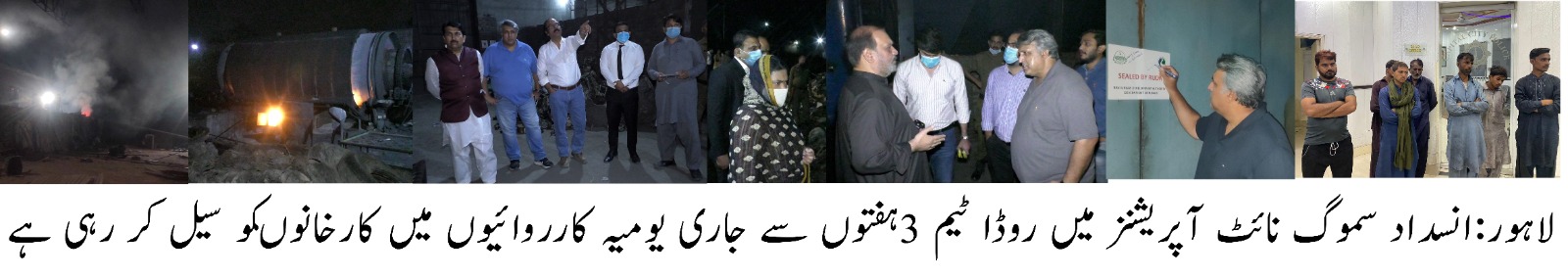 ماہ اکتوبر کے اوئل سے کئے گئے انٹی سموگ نائٹ آپریشن میں روڈا نے سب سے زیادہ کارروائیاں اپنے صنعتی زون میں کیں ،محکمانہ اعدادوشمار کے مطابق انتظامیہ نے 5 اکتوبر کو رمضان، خالداور اعجازپائیرولیسس پلانٹ کا سٹرکچرتوڑاجبکہ 12 اکتوبر کو محمود بوٹی میں ایم کے سٹیل، پاور سٹیل کرول گھاٹی اور ذولفقار پائیرولائسس پلانٹ کو سر بمہر کیا اس موقع پر7 ملازم گرفتار بھی ہوئے 16 اکتوبر کو انٹی سموگ قواعد کی خلاف ورزی پر داتا سٹیل، مغل سٹیل، عبداللہ سٹیل، عبداللہ برادرز اور فیضان سٹیل کو سیل کیاگیاروڈا ٹیم نے اس موقع پر ایم کے سٹیل کو اسکربر لگانے پر کھول بھی دیا 17 اکتوبر آپریشن میں چہار باغ 2 ایریا میں تحفظ ماحول کی خاطر غیر قانونی ریت نکالنے والوں پر کارروائی کرتے سامان قبضہ میں لیا گیا 22 اکتوبر کو مدینہ، ارشد سٹیل ملز ،ترک روڈ ٹی اے ٹیکنالوجی فرنس، گلزار سٹیل مل اور عظیم پائیرولیسس پلانٹ کو بندش کا سامنا کرنا پڑا 23اکتوبر کو انسداد سموگ نائٹ آپریشن میں ایک صنعتی یونٹ جبکہ 24 اکتوبر کو 2 فیکٹریاں زبیرسیزر اور ماشاءاللہ سٹیل