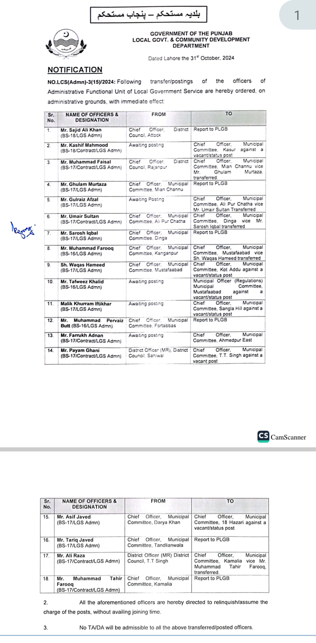 عمیر سلطان کو چیف آفیسر میونسپل کمیٹی ڈنگہ تعینات کر دیا گیا ۔چیف آفیسر میونسپل کمیٹی ڈنگہ سروش اقبال کو او ایس ڈی بنا دیا گیا ہے۔ چیف آفیسر میںونسپل کمیٹی کنگن پور کو میونسپل کمیٹی مصطفیٰ آباد تعینات کر دیا گیا ہے۔وقاص حمید کو چیف آفیسر میونسپل کمیٹی کوٹ اددو تعینات کر دیا گیا ہے۔