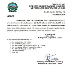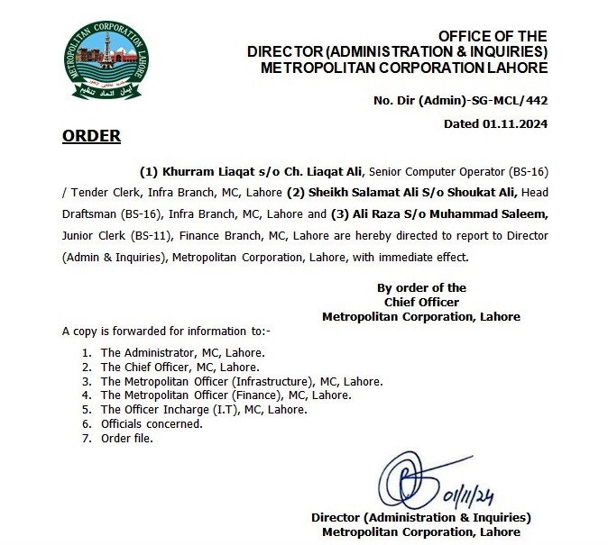 (1) خرم لیاقت ولد چوہدری لیاقت علی، سینئر کمپیوٹر آپریٹر (BS-16) / ٹینڈر کلرک، انفرا برانچ، MC، لاہور (2) شیخ سلامت علی ولد شوکت علی، ہیڈ ڈرافٹسمین (BS-16)، انفرا برانچ، MC، لاہور اور (3) ) علی رضا ولد محمد سلیم، جونیئر کلرک (BS-11)، فنانس برانچ، MC، لاہور کو ہدایت کی جاتی ہے کہ وہ ڈائریکٹر (ایڈمن اینڈ انکوائریز) میٹرو پولیٹن کارپوریشن، لاہور کو فوری طور پر رپورٹ کریں۔