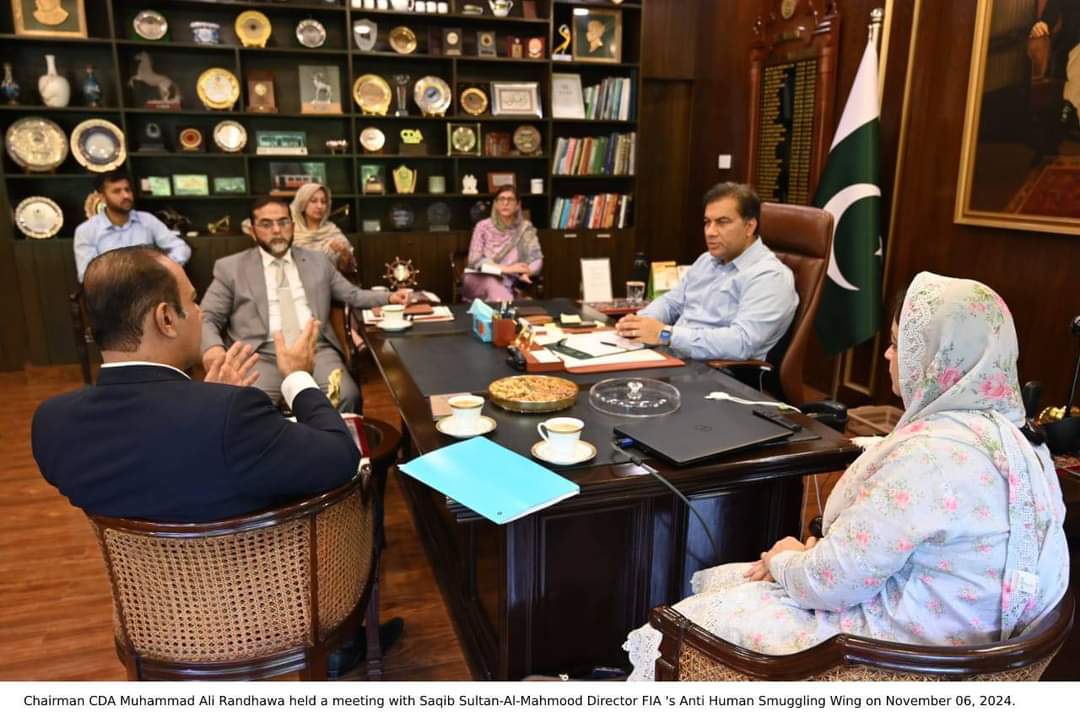 چیئرمین کیپٹل ڈویلپمنٹ اتھارٹی (سی ڈی اے) اور چیف کمشنر اسلام آباد محمد علی رندھاوا نے ایف آئی اے کے انسداد انسانی اسمگلنگ ونگ کے ڈائریکٹر ثاقب سلطان محمود سے انسانوں کی سمگلنگ (ٹی آئی پی) سے متعلق مسائل کے حل کے لیے ملاقات کی۔ آئی سی ٹی کے شعبہ جات نے بھی شرکت کی۔