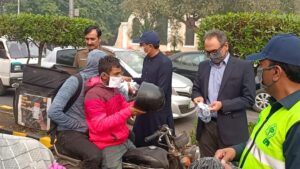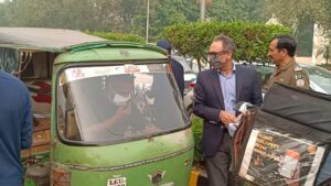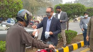 کمشنر لاہور زید بن مقصود نے مال روڈ پر انسداد سموگ کے سلسلے میں موٹرسائیکل سوار، رکشہ ڈرائیورز، رکشہ مسافروں اور گاڑیوں میں موجود شہریوں میں ماسک تقسیم کیے،