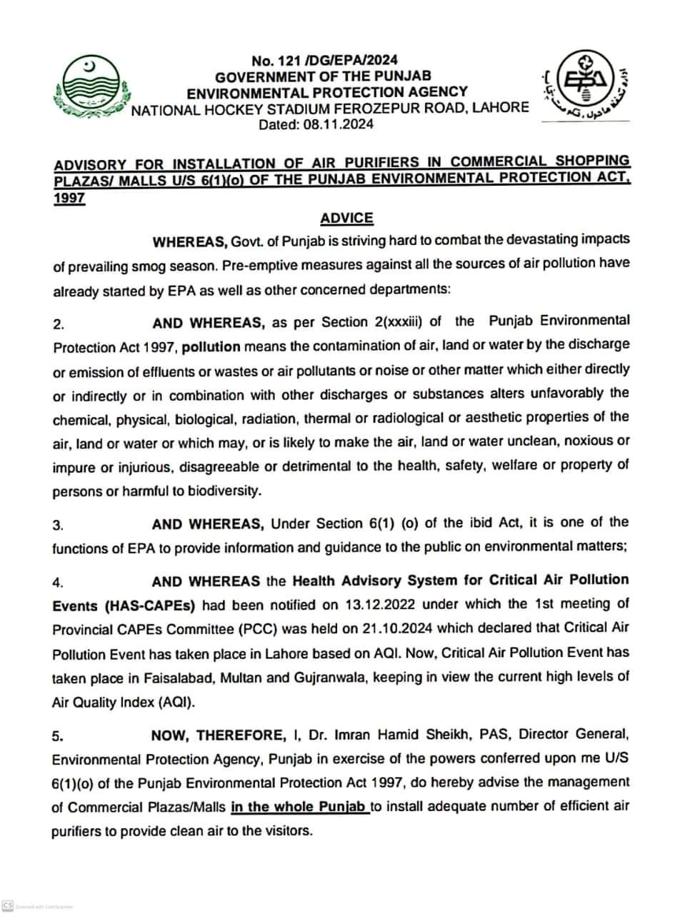 پنجاب کے تمام شاپنگ مالز اور کمرشل پلازوں کو ائیر پیوریفائررز لگانے کی ہدایت جاری کر دی گئی ہیں۔محکمہ تحفظ ماحول پنجاب کے مطابق لاہور، فیصل آباد، ملتان، گوجرانوالہ ڈویژنز میں خراب ائیرکوالٹی کے پیش نظر فیصلہ کیا گیا ہے۔