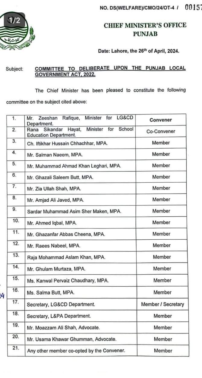 وزیر اعلٰی پنجاب مریم نواز شریف نے پنجاب لوکل گورنمنٹ ایکٹ 2022 پر ازسرنو غور اور صوبہ پنجاب کے بلدیاتی نظام کو بہتر کرنے کے لئے ہائی لیول کمیٹی قائم کر دی ہے ۔ وزیر بلدیات اور وزیر تعلیم کمیٹی کے کنوینئر اور ڈپٹی کنوینئر ہوں گے ۔ ایم پی اے اراکین اسمبلی بھی کمیٹی کا حصہ ہوں گے