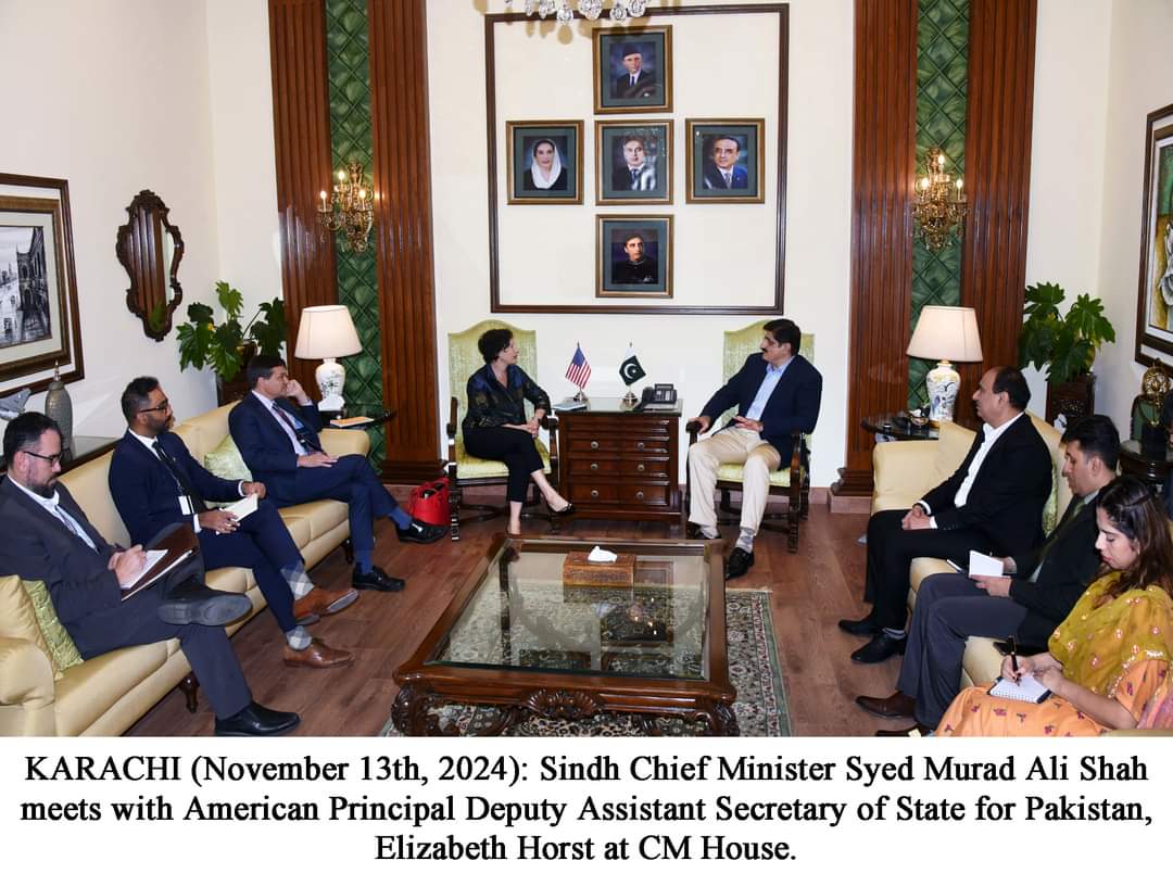 وزیراعلیٰ سندھ مراد علی شاہ اور امریکی پرنسپل ڈپٹی اسسٹنٹ سیکریٹری آف اسٹیٹ الزبتھ ہارسٹ کے درمیان وزیراعلیٰ ہاؤس میں ملاقات کے دوران موسمیاتی تبدیلی، سماجی ترقی اور معیشت سمیت باہمی دلچسپی کے امور پر تبادلہ خیال کیا گیا۔