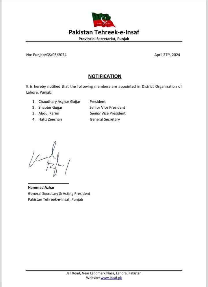 پارٹی نے نئی نامزدگیوں کا نوٹیفکیشن جاری کردیا،،،