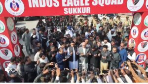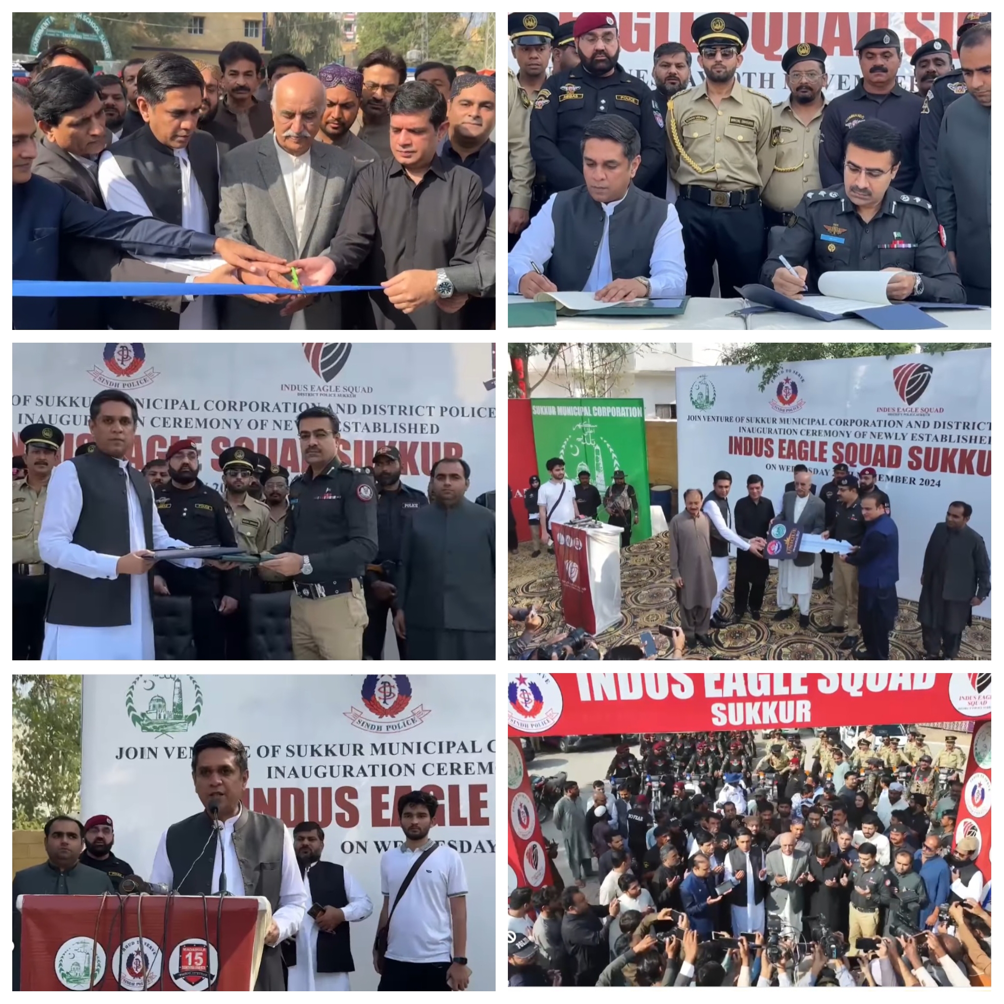 انڈس ایگل اسکواڈ سکھر کی لانچنگ کی پروقار تقریب پولیس مددگار 15 پر منقعد ہوئی۔تقریب میں رکن قومی اسمبلی سید خورشید احمد شاہ ، ایم این اے نعمان اسلام شیخ نے مہمان خصوصی کے طور پر شرکت کی۔میونسپل کارپوریشن سکھر کی جانب سے میئر سکھر بیریسٹر ارسلان اسلام شیخ اور سکھر پولیس کی طرف سے ایس ایس پی سکھر امجد شیخ نے جوائنٹ وینچر کے ایم او یو پر دستخط کئے۔ایم این اے سید خورشید احمد شاہ ، ایم این اے نعمان اسلام شیخ نے ترجمان سندھ حکومت و میئر سکھر بیریسٹر ارسلان اسلام شیخ اور ایس ایس پی سکھر امجد شیخ کے ہمراہ ربن کاٹ کر انڈس ایگل اسکواڈ کا باضابطہ افتتاح کیا۔میئر سکھر بیریسٹر ارسلان اسلام شیخ نے ایس ایس پی سکھر امجد شیخ کو اسکواڈ کے لیے موٹر بائیک کی چابی حوالے کی۔ انڈس ایگل اسکواڈ 60 اہلکاروں پر مشتمل ہے ، ترجمان سندھ حکومت و میئر سکھر بیریسٹر ارسلان اسلام شیخ نے بتایا کہ ایگل اسکواڈ میں میونسپل کارپوریشن سکھر کی اینٹی انکروچمنٹ کے 20 اہلکار بھی شامل ہیں۔میونسپل کارپوریشن سکھر نے 30 موٹر بائیکس انڈس ایگل اسکواڈ کو دی ہیں۔ انڈس ایگل اسکواڈ شہر کی 24 گھنٹہ نگرانی کرے گا۔اسکواڈ میں جلد خواتین اہلکار بھی شامل کی جائیں گی۔اسکواڈ کا مقصد شہر کی امن امان کی صورتحال کو مزید بہتر کرنا ہے۔ سٹریٹ کرائم ، منشیات اور شہر سے تجاوزات کا خاتمہ اسکواڈ کے فرائض میں شامل ہے۔ایس ایس پی سکھر امجد شیخ نے کہا کہ انڈس ایگل اسکواڈ شہر کو محفوظ بنانے کیلئے بہترین اضافہ ہے۔شہر کی نگرانی کرنے میں آسانی ہوگی۔انڈس ایگل اسکواڈ جرائم ، منشیات اور دیگر سماجی برائیوں کی شکایات پر بروقت کارروائی عمل میں لائے گا۔پیٹرولنگ میں بہتری آئے گی ، اور موٹر سائیکل سنیچنگ کو روکنے میں مدد ملے گی۔