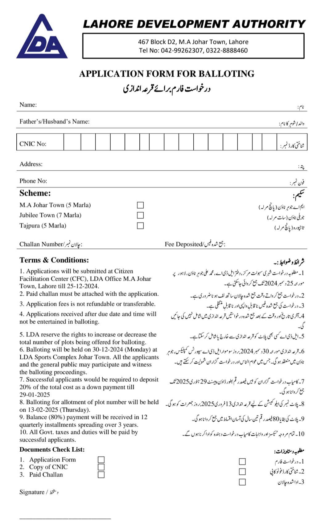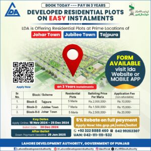 ڈی جی ایل ڈی اے طاہر فاروق کی ہدایت پر شہریوں کورہائشی پلاٹ آسان اقساط میں دینے کے لئے ایل ڈی اے نے درخواستیں جمع کرنا شروع کر دی ہیں۔ شہری اپنی درخواستیں ایل ڈی اے موبائل ایپ، ویب سائٹ سے ان لائن اپلائی کر سکتے ہیں۔ ایل ڈی اے سیٹیزن فیسلٹیشن سنٹر پر بھی قرعہ اندازی کی درخواستیں جمع کرائی جا سکتی ہیں۔