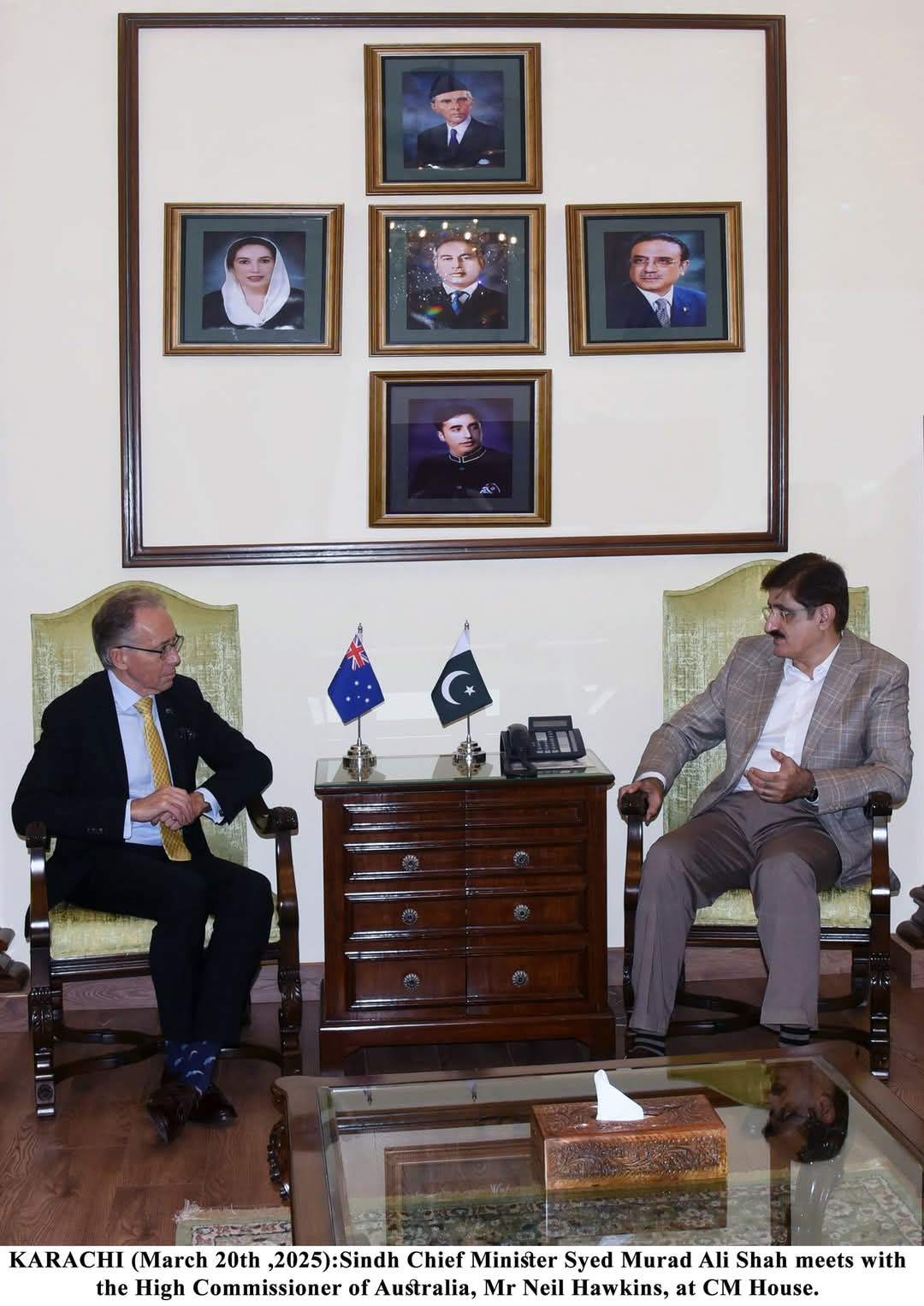 وزیر اعلیٰ سندھ سید مراد علی شاہ سے آسٹریلوی ہائی کمشنر نیل ہاکنز نے وزیر اعلیٰ ہاؤس میں ملاقات کی جس میں دوطرفہ تعلقات اور باہمی دلچسپی کے امور پر تبادلہ خیال کیا گیا۔ ملاقات کے دوران وزیر اعلیٰ سندھ نے آسٹریلوی سرمایہ کاروں کو صوبے کے زرعی شعبے میں مواقع تلاش کرنے کی دعوت دی۔ انہوں نے زرعی ترقی اور تکنیکی جدت کے لیے صوبائی حکومت کے عزم پر زور دیا۔ ہائی کمشنر نیل ہاکنز نے اس موقع پر بتایا کہ آسٹریلیا مہران یونیورسٹی کے ساتھ ایسی فصلوں پر تحقیق میں تعاون کر رہا ہے جو شدید موسمی حالات کا مقابلہ کر سکتی ہیں۔وزیر اعلیٰ سندھ نے کہا کہ ان کی حکومت کامیاب پبلک پرائیویٹ پارٹنرشپ ماڈل پر کام کر رہی ہے۔ انہوں نے بتایا کہ کراچی میں شاہراہِ بھٹو کی تعمیر مکمل ہو چکی ہے اور رواں سال کے آخر تک اسے مکمل طور پر ٹریفک کے لیے کھول دیا جائے گا۔ انہوں نے بتایا کہ شاہراہِ بھٹو کو بندرگاہ سے جوڑنے کا منصوبہ بنایا جا رہا ہے جس سے بندرگاہ سے موٹر وے تک براہِ راست رسائی ممکن ہو سکے گی اور ٹریفک کے دباؤ میں نمایاں کمی آئے گی۔کراچی کی بطور اہم سرمایہ کاری مرکز کی صلاحیت پر بات کرتے ہوئے وزیر اعلیٰ مراد علی شاہ نے غیر ملکی سرمایہ کاروں کو شہر میں دستیاب مواقع سے فائدہ اٹھانے کی ترغیب دی۔ ہائی کمشنر نیل ہاکنز نے سندھ کے ساتھ صحت کے شعبے میں تعاون جاری رکھنے کے عزم کا اظہار کیا۔ دونوں رہنماؤں نے ماں اور بچے کی صحت سے متعلق منصوبوں اور صوبے میں امیونائزیشن مہم کو مزید مؤثر بنانے کے اقدامات پر بھی تبادلہ خیال کیا۔یہ ملاقات سندھ اور آسٹریلیا کے درمیان مختلف شعبوں میں تعاون کو مزید مضبوط بنانے کی جانب ایک اور اہم قدم ثابت ہوئی۔