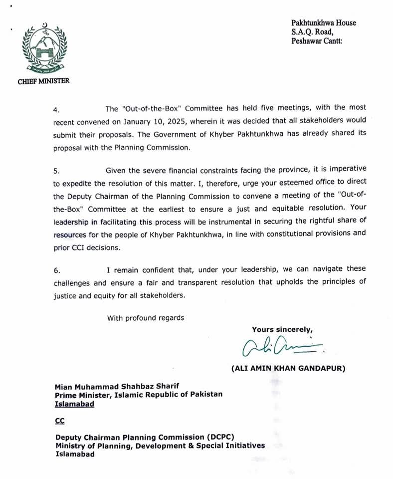 بعد ازاں صوبوں کو پن بجلی کے خالص منافع کی ادائیگیوں کے معاملے کا اوٹ آف دی باکس حل تجویز کرنے کے لئے ایک اور کمیٹی تشکیل دی گئی۔آوٹ آف دی باکس کمیٹی نے اسی معاملے کے حل کی طرف پیشرفت کے لئے تمام شراکت داروں سے تجاویز طلب کی ہے۔ خیبر پختونخوا حکومت نے اس سلسلے میں اپنی تجاویز پلاننگ کمیشن کو ارسال کردی ہے۔خیبر پختونخوا حکومت کو درپیش مالی بحران کے پیش نظر اس مسلئے کے فوری حل کی ضرورت ہے۔لہذا آوٹ آف دی باکس کمیٹی کا اجلاس جلد بلانے کے لئے پلاننگ کمیشن کو احکامات جاری کئے جائیں۔تاکہ آئین کے تقاضوں اور مشترکہ مفادات کونسل کے فیصلوں کے مطابق اس دیرینہ مسئلے کا منصفانہ حل نکالا جاسکے۔ امید ہے آپ خیبر پختونخوا کے عوام کو ان کے آئینی اور قانونی حقوق دلانے میں قائدانہ کردار ادا کریں گے۔
