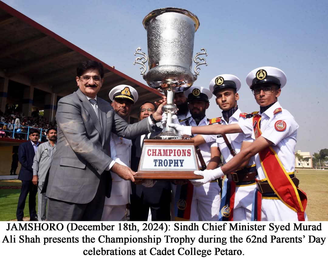 PETARO (Jamshoro – Dec 18): Sindh Chief Minister Syed Murad Ali Shah, speaking at the 62nd Parents’ Day celebrations at Cadet College Petaro, announced significant initiatives, including the installation of a 1.5MW solar power system to solarise the entire college and the provision of two gross salaries as a bonus for the college staff.