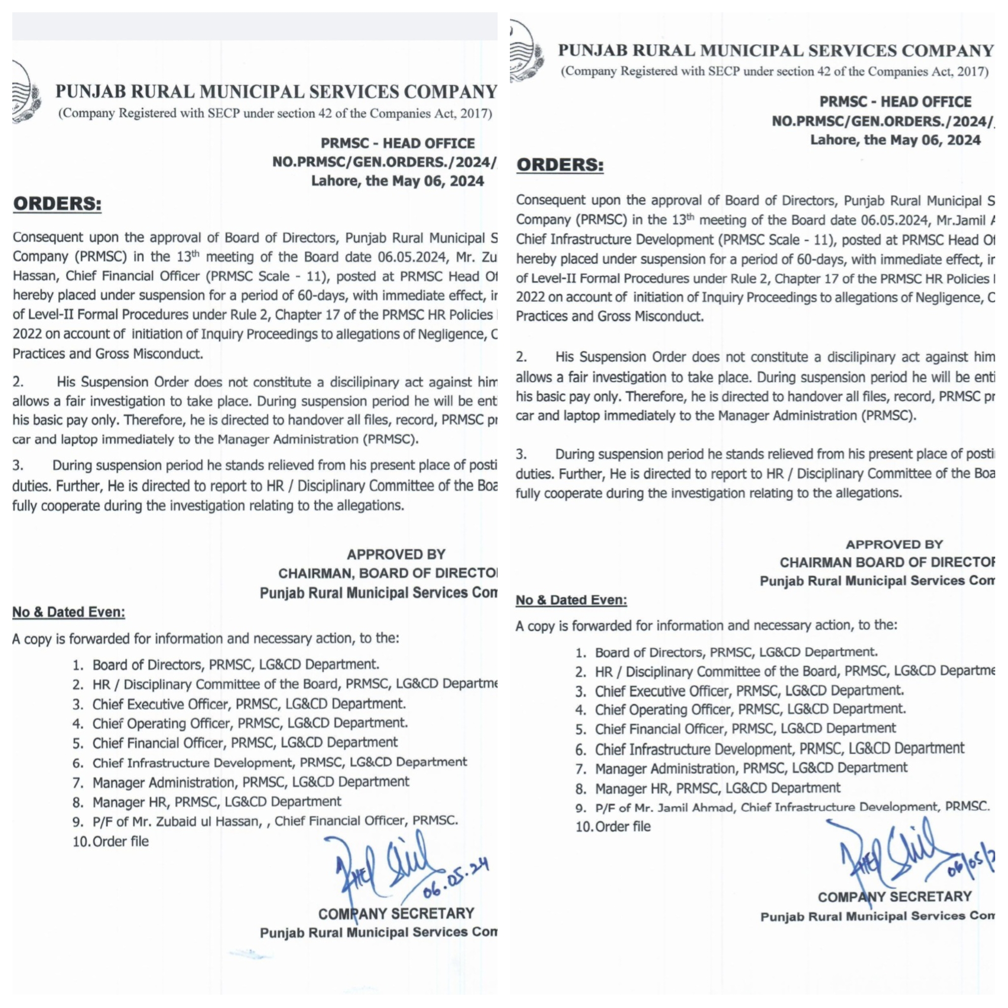 کمپنی کے بورڈ کی ایچ آر کمیٹی نے دونوں اعلٰی افسران کے خلاف انکوائری شروع کر دی ہے۔پنجاب رورل میونسپل سروسز کمپنی کے ان افسران کو فرائض سےغفلت،کرپشن اور مس کنڈکٹ کے الزامات کی انکوائری کرنے کے لیے 60 دن کے لئے معطل کیا گیا ہے۔افسران کی معطلی کی منظوری پنجاب رورل میونسپل سروسز کمپنی کے بورڈ اف ڈائریکٹرز کے اجلاس میں دی گئی۔کمپنی کے چیف فنانشل افیسر سید زبید الحسن کو معطل کر دیا گیا ہے۔کمپنی کے چیف انفراسٹرکچر ڈویلپمنٹ (چیف انجینئر )جمیل احمد کو بھی معطل کرنے کے احکامات جاری کر دیئے گئے ہیں۔