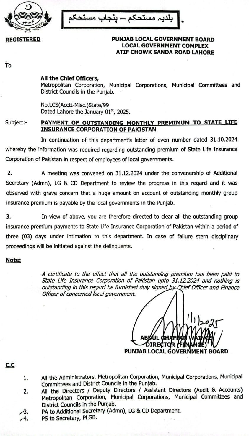 محکمہ بلدیات پنجاب نے تمام بلدیاتی اداروں کو اسٹیٹ لائف انشورنس کارپوریشن آف پاکستان کو بقایا ماہانہ پریمیم کی ادائیگی یقینی بنانے کے احکامات جاری کردیئے ہیں۔بلدیاتی اداروں کے چیف افسران کو تین دن کی مہلت دی گئی ہے ۔ناکامی یا کوتاہی کی صورت میں سخت تادیبی کارروائی عمل میں لائی جائے گی۔محکمہ بلدیات نے میٹروپولیٹن کارپوریشن، میونسپل کارپوریشنز، میونسپل کمیٹیوں اور ضلع کونسلز کو جاری مراسلہ میں اسٹیٹ لائف کو ماہانہ گروپ انشورنس پریمیم کی مد میں بڑی رقم ادا نہ کرنے پر تشویش کا اظہار کیا ہے اور واضع کیا ہے کہ بلدیاتی اداروں کے ملازمین کے لئے اسٹیٹ لائف انشورنس کارپوریشن آف پاکستان کے بقایا پریمیم کی فوری ادائیگیاں کی جائیں۔ایڈیشنل سیکرٹری ایڈمن لوکل گورنمنٹ اینڈ کمیونٹی ڈویلپمنٹ کی زیر صدارت اجلاس میں ہونے والے فیصلے کی روشنی میں مراسلہ جاری کیا گیا ہے۔