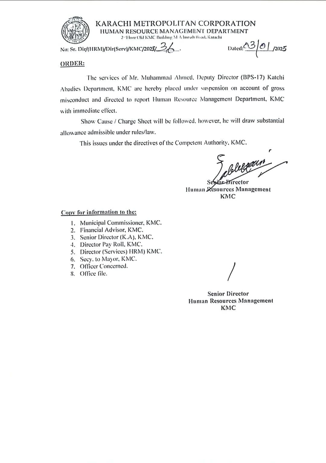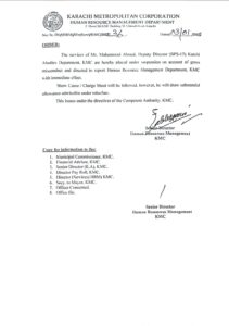 میئر نے ڈپٹی ڈائریکٹر کچی آبادی محمد احمد کو معطل کر دیا اور شہریوں اور مکینوں کی شکایت پر تحقیقات کا حکم دیا۔ عوام کو سہولت اور شکایات کے ادراک کے لیے میئر کارپوریشن کے معاملات پر گہری نظر رکھتے ہیں ،اور اس ہفتے میں یہ دوسری معطلی ہے۔