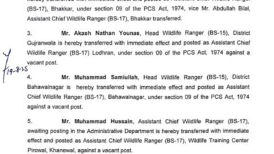 وائلڈلائف رینجرز پنجاب کے تین افسران کے تبادلے