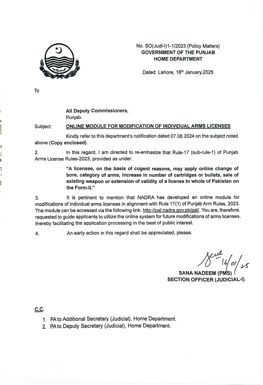 وزیراعلی پنجاب کی ہدایت کے مطابق محکمہ داخلہ پنجاب اسلحہ لائسنس کے حوالے سے عوامی سہولت کیلئے انقلابی اقدامات اٹھا رہا ہے۔ محکمہ داخلہ پنجاب نے شہریوں کی سہولت کیلئے انفرادی اسلحہ لائسنس میں ترمیم و تبدیلی کا تمام عمل آن لائن کر دیا۔ شہری اسلحہ بور کی تبدیلی، اسلحہ کیٹیگری میں تبدیلی، گولیوں میں اضافے کی درخواست، اسلحہ لائسنس کی وراثتی منتقلی، ڈوپلیکیٹ لائیسنس، موجودہ اسلحے کی فروخت اور پاکستان بھر میں لائیسنس کی معیاد میں ایکسٹینشن کی درخواست آن لائن دے سکتے ہیں۔ نئے ماڈیول کے مطابق پنجاب بھر میں موجود شہری اپنے اسلحہ لائسنس میں موڈیفیکیشن کی درخواست آن لائن دیں گے اور اب شہریوں کو اسلحہ لائسنس کے حوالے سے دفاتر کے چکر نہیں لگانا ہوں گے۔ ترجمان محکمہ داخلہ پنجاب کے مطابق اسلحہ لائسنس میں تبدیلی کیلئے تمام متعلقہ کاغذات سے لیکر قانونی فیس تک آن لائن جمع کروائی جا سکتی ہے۔ محکمہ داخلہ پنجاب اور نادرا کے اشتراک سے اسلحہ لائسنس کیلئے آن لائن موڈیول پنجاب آرمز رولز 2023 کے تحت تیار کیے گئے ہیں۔ شہری دیے گئے لنک http://pal.nadra.gov.pk/pal پر آن لائن اپلائی کر سکتے ہیں۔ محکمہ داخلہ پنجاب نے تمام ڈپٹی کمشنرز کو اسلحہ لائسنس کیلئے آن لائن موڈیول کے استعمال بارے مراسلہ جاری کیا ہے جس میں کہا گیا ہے کہ تمام ڈپٹی کمشنرز اسلحہ لائسنس میں تبدیلی کیلئے آنے والے شہریوں کو آن لائن موڈیول بارے آگاہی دیں۔