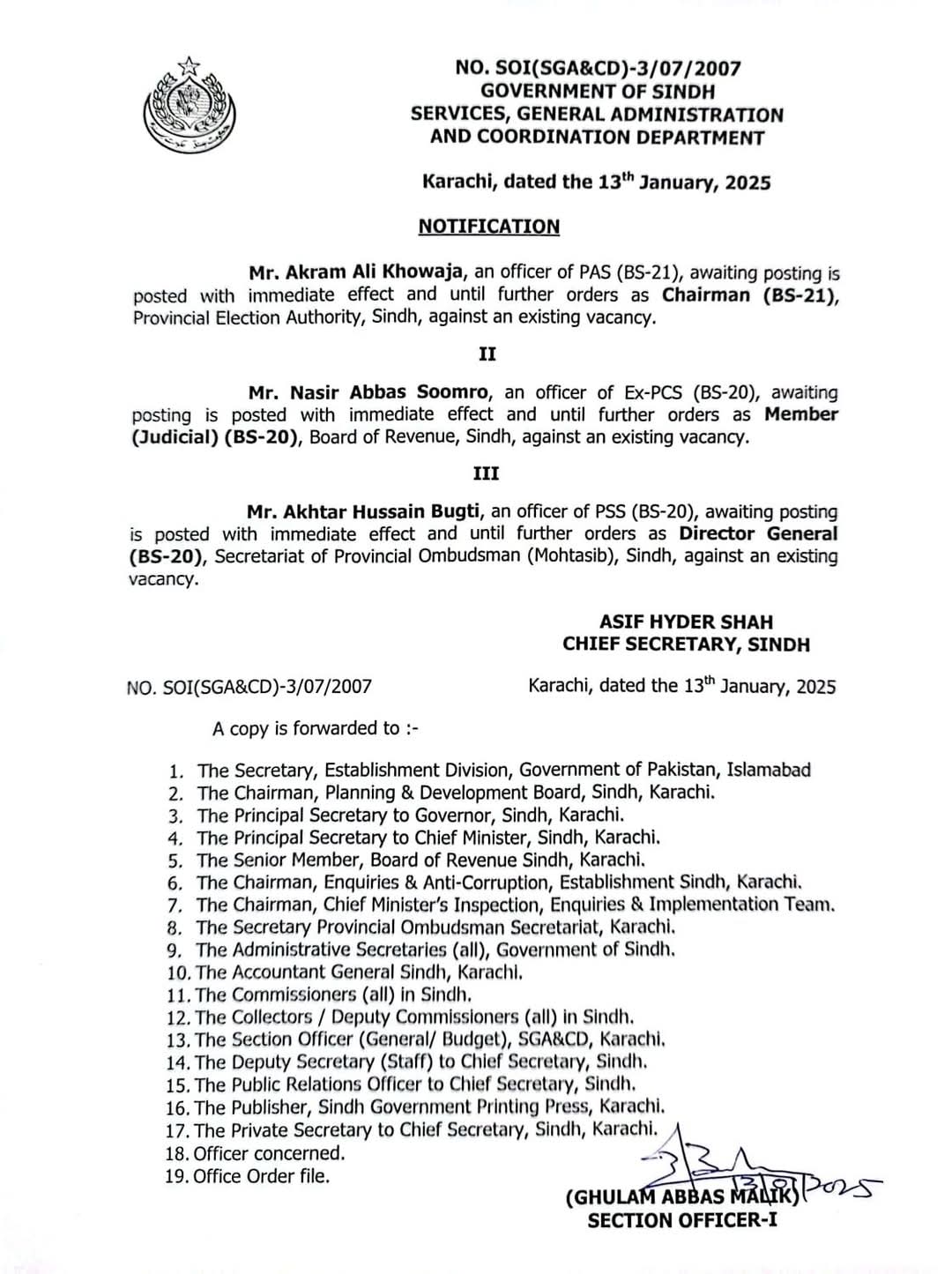 اکرم علی خواجہ، PAS (BS-21) چیئرمین (BS-21)، صوبائی الیکشن اتھارٹی، سندھ تعینات کر دیا گیا ہے۔ناصر عباس سومرو ممبر (جوڈیشل) (BS-20) بورڈ آف ریونیو، سندھ تعینات کرنے کے احکامات جاری کئے گئے ہیں۔اختر حسین بگٹی ڈائریکٹر جنرل (BS-20)، صوبائی محتسب (محتسب)، سندھ کے سیکریٹریٹ تعینات کیا گیا ہے۔