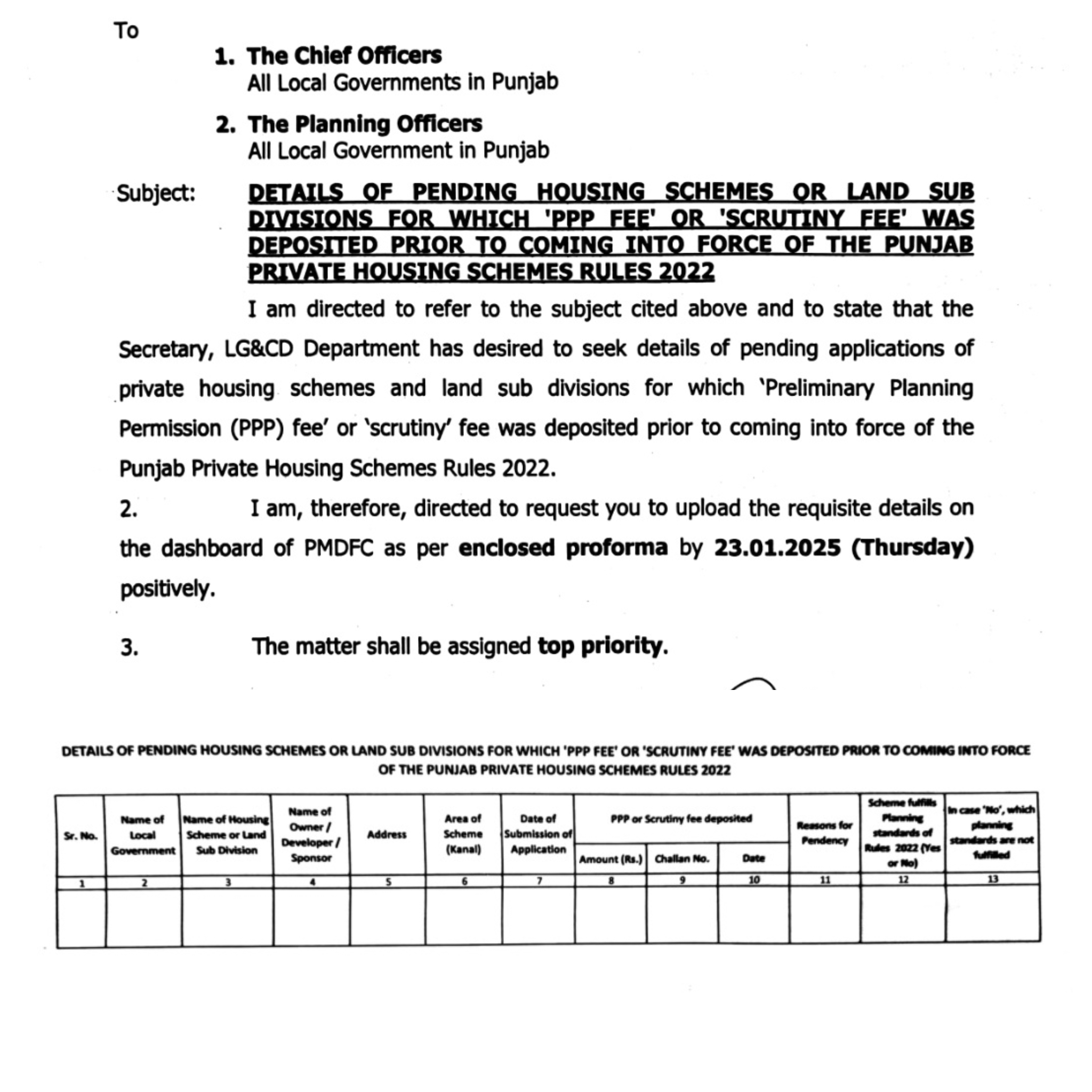 پنجاب کی میونسپل کارپوریشنز،ضلع کونسلز اور میونسپل کمیٹیوں کو مراسلہ سیکرٹری لوکل گورنمنٹ اینڈ کمیونٹی ڈویلپمنٹ کی جانب سے جاری کیا گیا ہے۔پنجاب پرائیویٹ ہاؤسنگ سکیم رولز 2022 کے نافذ ہونے سے پہلے جمع کروائے گئے کیسز کی تفصیلات فراہم کی جائیں گی۔واضع رہے کہ میٹروپولیٹن کارپوریشن لاہور کے پاس ہاؤسنگ سکیموں اور لینڈ سب ڈویژنوں کی منظوری کے اختیارات ہی نہیں ہیں جو سلب کر کے ایل ڈی اے کو منتقل کر دیئے گئے تھے۔