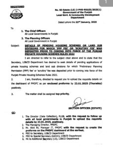 محکمہ بلدیات پنجاب نے تمام بلدیاتی اداروں سے زیر التواء ہاؤسنگ سکیموں اور لینڈ سب ڈویژنوں کی تفصیلات مانگ لی ہیں۔چیف افسران اور شعبہ پلاننگ کے سربراہان سے اس حوالے سے مکمل ڈیٹا پی ایم ڈی ایف سی کے ڈیش بورڈ پر اپ لوڈ کرنے کی ہدایت کی گئی ہے۔جس میں لوکل گورنمنٹ کا نام،ہاؤسنگ سکیم یا لینڈ سب ڈویژن کا نام،مالک،ڈویلپر،سپانسر کا نام و پتہ،سکیم کا رقبہ،درخواست جمع کروانے کی تاریخ،پی پی پی یا سکروٹنی فیس کی تفصیلات، چالان نمبر،تاریخ،التواء کی وجوہات، سکیم پنجاب پرائیویٹ ہاؤسنگ سکیم رولز 2022 کے پلاننگ معیارات پر پورا اترتی ہے یا ہاں یانہیں میں جواب اور نہیں کی صورت میں کون سے معیارات پورے نہیں ہوتے تفصیلات شامل ہیں۔