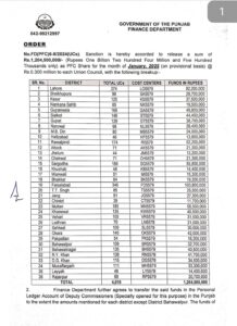 محکمہ خزانہ پنجاب نے 4015 یونین کونسلز کے لئے ایک ارب 20 کروڑ 45 لاکھ روپے کی گرانٹ جاری کر دی
