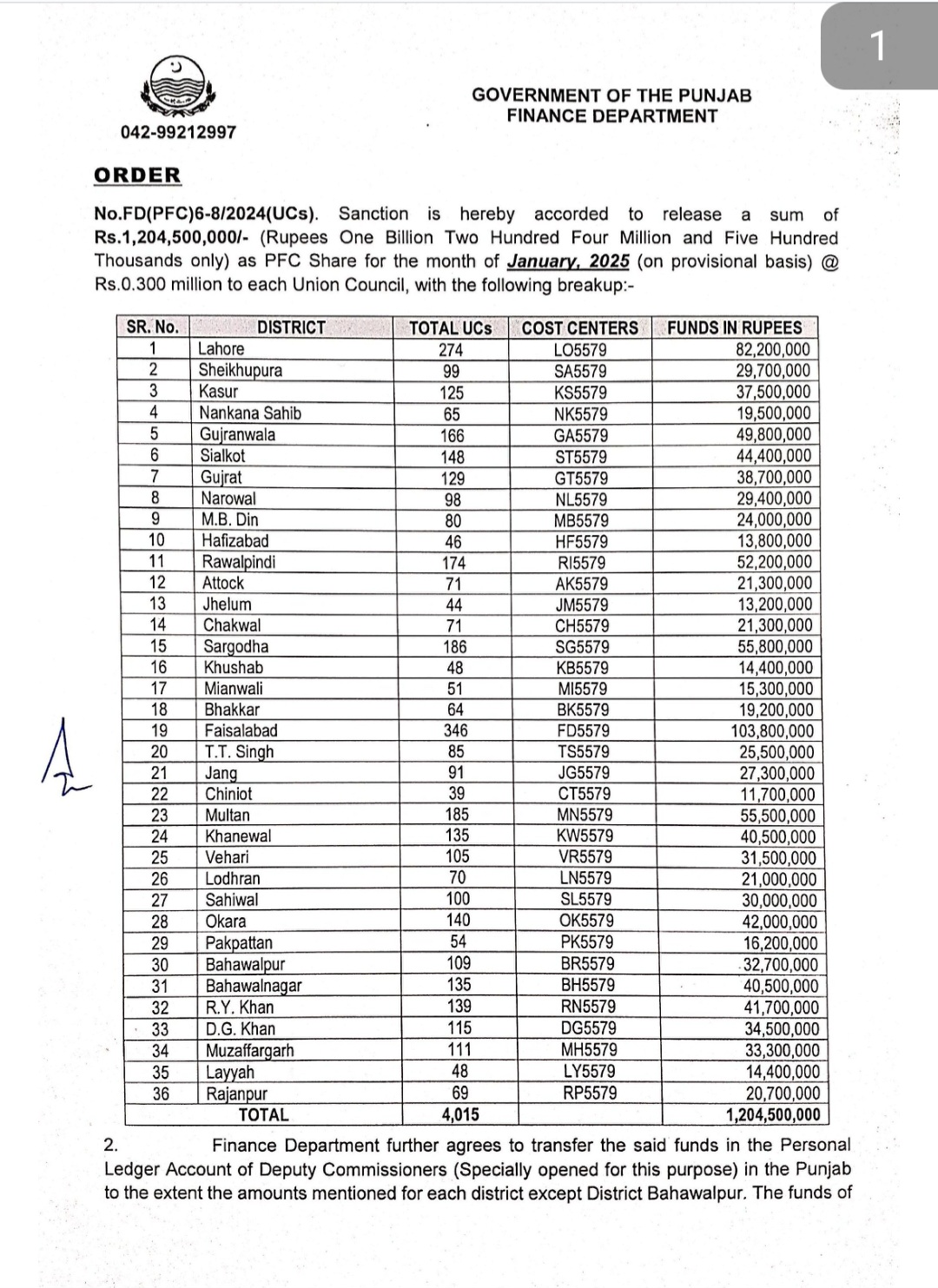 محکمہ خزانہ پنجاب نے 4015 یونین کونسلز کے لئے ایک ارب 20 کروڑ 45 لاکھ روپے کی گرانٹ جاری کر دی ہے۔رواں سال کے پہلے پی ایف سی شیئر کی مد میں فی یونین کونسل 3 لاکھ روپے کا اجراء کیا گیا ہے۔