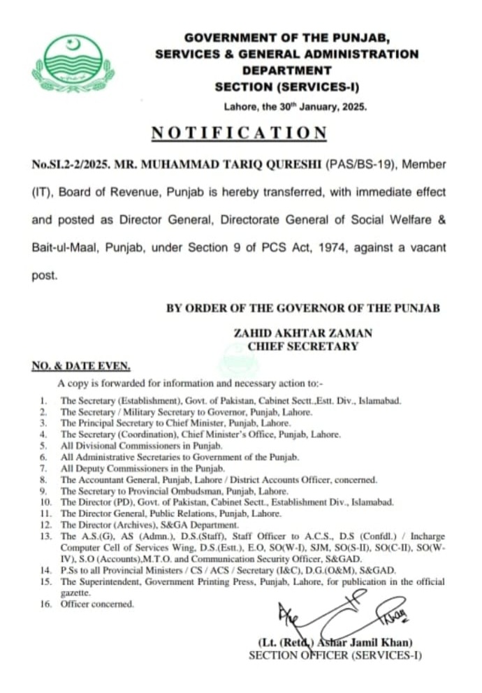 حکومت پنجاب نے ممبربورڈ آف ریونیو محمد طارق قریشی کو ڈائریکٹر جنرل سوشل ویلفیئر اینڈ بیت المال تعینات کردیا ہے۔چیف سیکرٹری پنجاب زاہد اختر زمان کی طرف سے نوٹیفکیشن جاری کردیا گیا ہے