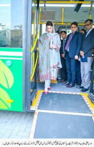 بریفنگ میں بتایاگیا کہ الیکٹرک بس میں جی پی ایس لوکیشن ریکارڈر،وائی فائی، یو ایس بی پورٹ اور دیگر سہولیات موجود ہیں۔ الیکٹرک بس میں 30نشستیں،80مسافروں کی گنجائش ہو گی۔ الیکٹرک بس میں سپیشل افراد کے لئے ریمپ اور نشستیں مخصوص ہو گی۔ پہلی بار میں الیکٹرک بس میں مسافروں کے تحفظ کے لئے فرش پر اینٹی سلپ شیٹ کا استعمال کیا گیا ہے۔پاکستان کی مکمل الیکٹرک بس کے لئے گرین ٹاؤن ہمدرد چوک ڈپو میں 9 مخصوص چارجنگ سٹیشن قائم کیے گئے،ہرچارجنگ کے بعد 250 کلومیٹر فاصلہ طے کر سکے گی اورچار مرتبہ روٹ مکمل کرسکے گی۔ بس میں مسافروں کی سہولت کے لئے روٹ ڈسپلے بھی نظر آئے گا۔ الیکٹرک بس میں خواتین کے لئے الگ فی میل سیکشن ہو گااوراس کے ساتھ ساتھ ہراسانی کے واقعات کے سد باب کے لئے کیمرے بھی نصب ہوں گے۔بریفنگ میں بتایاگیاکہ لاہورکے سب سے بڑے طویل ترین 21کلو میٹر روٹ پر 27الیکٹرک بسیں چلائی جائیں گی۔ ریلوے سٹیشن تا گرین ٹاؤن براستہ کوئینز روڈ، مزنگ، فیروز پور روڈ،کیمپس پل اور اچھر ہ نہرسے ای بس سروس شروع ہوگی۔ لاہور کی پہلی ای بس سروس پر 17ہزار مسافر روزانہ سفر کر سکیں گے۔ ریلوے سٹیشن تا گرین ٹاؤن روٹ ای وی بس سروس کا باقاعدہ آغاز فروری کے وسط میں ہوگا۔ ریلوے سٹیشن تا گرین ٹاؤن روٹ پر42 جدید ترین بس شیلٹر قائم ہونگے اورہر9منٹ کے بعد بس آئے گی۔ الیکٹرک بس کے لئے مخصوص ایپ بھی متعارف کرائی جائے گی اوربس کی ٹریکنگ ممکن ہو گی۔ الیکٹرک بس کا کرایہ ڈیجیٹل والٹ،ڈیجیٹل کارڈ کے ذریعے ادا کیا جا سکے گا۔ یورنیورسل ٹرانسپورٹ کارڈ بھی ایشو کئے جائیں گے۔ الیکٹرک بس کے لئے70 ڈرائیور کی سپیشل ٹریننگ کا آغاز ہو گیا ہے۔دریں اثناء وزیراعلی مریم نواز شریف کی زیر صدارت اجلاس میں ای ٹیکسی پراجیکٹ کابھی جائزہ لیا گیا۔وزیراعلیٰ مریم نواز شریف نے بس سٹینڈ پر سولر فین اور واٹر کولر کی تنصیب کا جائزہ لینے کی ہدایت کی اورہر بس سٹینڈ پرسیف سٹی کیمرے نصب کرنے کا حکم دیا۔ وزیراعلی مریم نواز شریف کی ای ٹیکسی کی پنجاب میں اسمبلنگ کا جائزہ لینے اور نجی اشتراک سے الیکٹرک چارجنگ اسٹیشن قائم کرنے کے اقدامات کی ہدایت کی۔