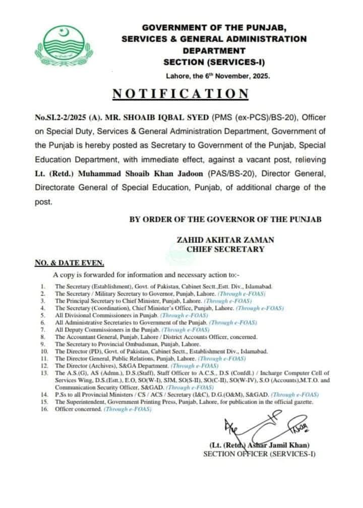 حکومت پنجاب نے تقرری کے منتظر سید شعیب اقبال بخاری کو سیکرٹری سپیشل ایجوکیشن ڈیپارٹمنٹ تعینات کر دیا ہے۔وہ پی ایم ایس گریڈ20 کے آفیسر ہیں۔جو وسیع محکمانہ اور انتظامی تجربہ رکھتے ہیں۔چیف سیکرٹری پنجاب زاہد اختر زمان کی جانب سے ان کی تقرری کا نوٹیفکیشن جاری کر دیا گیا ہے۔