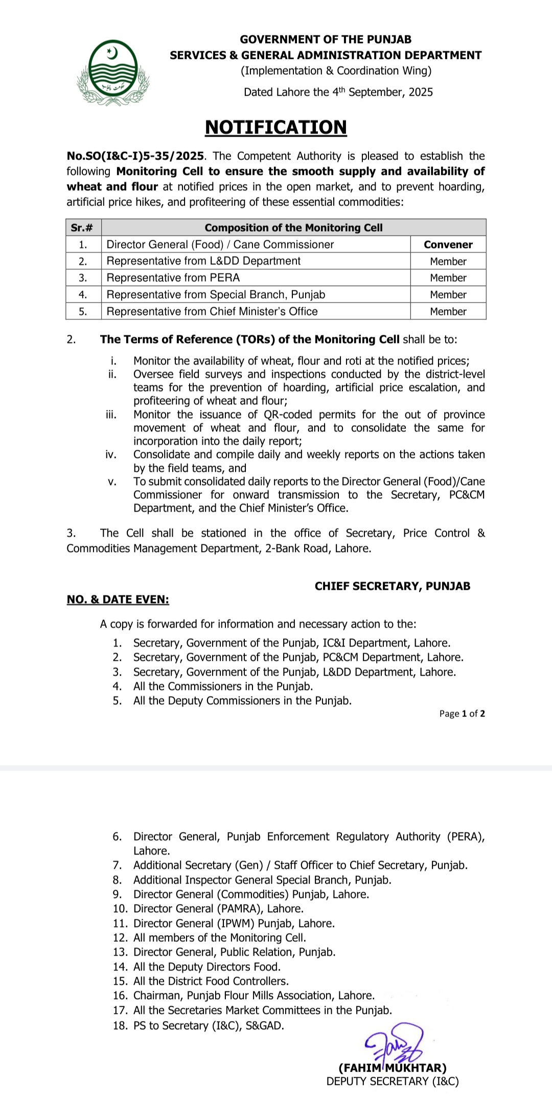 وزیر اعلیٰ پنجاب کی ہدایت پر گندم کی ناجائز ذخیرہ اندوزی اور مہنگا آٹا فروخت کرنیوالوں کیخلاف آپریشن جاری ہے،پنجاب حکومت نے پرائس کنٹرول ڈیپارٹمنٹ کے کمیٹی روم میں مرکزی مانیٹرنگ سیل قائم کر دیا ہے، ترجمان پرائس کنٹرول اینڈ کماڈیٹیز مینجمنٹ ڈیپارٹمنٹ کا کہنا تھا کہ مانیٹرنگ سیل کا مقصد آٹا اور گندم کی بلاتعطل فراہمی اور مقررہ نرخوں پر دستیابی کو یقینی بنانا ہے، مانیٹرنگ سیل میں ہر محکمے کا نمائندہ ڈیسک قائم ، فلور ملز، فیڈ ملز اور فوڈ گرین لائسنس ہولڈرز کی فہرستیں موجود ہیں، مانیٹرنگ سیل میں تمام اضلاع سے ڈیٹا اکٹھا کرنا شروع کر دیا گیا ہے، کمیٹی روم میں گندم اور آٹے کی قیمتوں ،اعدادوشمار اور تازہ صورتحال مسلسل مانیٹرنگ کی جارہی ہے، گندم اور آٹے کی نقل و حرکت پر نظر رکھنے کیلئے چیک پوسٹوں کی فہرستیں، سی سی ٹی وی مانیٹرنگ اور خفیہ رپورٹس پر مانیٹرنگ سیل کام کر رہا ہے، اسپیشل برانچ کے نمائندے بھی مانیٹرنگ سیل کا حصہ ، ذخیرہ اندوزی، اسمگلنگ اور مصنوعی مہنگائی کے حوالے سے بروقت معلومات پر کارروائیاں یقینی بنائی جائیں گی، مانیٹرنگ سیل روزانہ کی بنیاد پر گندم اور آٹے کی دستیابی، قیمتوں اور فیلڈ انسپکشنز کی رپورٹ ڈی جی فوڈ/کین کمشنر کو ارسال کرے گا، ڈی جی فوڈ/کین کمشنر مانیٹرنگ سیل کے کنوینر ہوں گے جبکہ ایل اینڈ ڈی ڈی، پی ای آر اے، اسپیشل برانچ اور وزیراعلیٰ آفس کے نمائندے بطور ممبران شریک ہیں۔