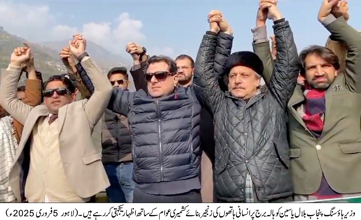 وزیر ہاؤسنگ اینڈ اربن ڈویلپمنٹ پنجاب بلال یاسین نے کشمیری عوام کے ساتھ اظہار یکجہتی کیلئے کوہالہ برج پر حکومت پنجاب کی نمائندگی کی ،وزیر ہاؤسنگ پنجاب نے عوام کی کثیر تعداد کے ہمراہ انسانی ہاتھوں کی زنجیر بناتے ہوئے دونوں اطراف کے بندھن کی تجدید کی،اس موقع پر تقریب سے خطاب میں صوبائی وزیر نے کہا کہ یہ ہاتھوں کی زنجیر نمائشی ہی نہیں بلکہ باہمی رشتے کی مزید مضبوطی کا عہد کر رہے ہیں،5 فروری تجدید عہد وفا کا دن ہے کہ ہم کشمیری عوام کی قربانیوں کو نہیں بھولے،میں وزیر اعلیٰ پنجاب مریم نواز کا پیغام لے کر یہاں آیا ہوں، وزیر ہاؤسنگ پنجاب نے مزید کہا کہ