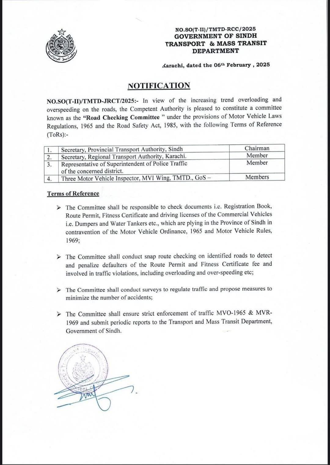 روڈ چیکنگ کمیٹی کی صدارت سیکریٹری صوبائی ٹرانسپورٹ اتھارٹی سندھ کریں گے۔سیکریٹری ریجنل ٹرانسپورٹ اتھارٹی کراچی، ٹریفک پولیس کے نمائندے، اور ایم وی آئی ونگ حکومت سندھ کے تین موٹر وہیکل انسپکٹر شامل ہوں گے ۔کمیٹی کی ذمہ داریوں میں تجارتی گاڑیوں کے ضروری دستاویزات جیسے رجسٹریشن بک، روٹ پرمٹ، فٹنس سرٹیفکیٹ، اور ڈرائیونگ لائسنس کی جانچ کرنا شامل ہے۔اوور لوڈنگ، اوور اسپیڈنگ اور دیگر ٹریفک خلاف ورزیوں کے روک تھام کے لئے کمیٹی مخصوص سڑکوں پر چیکنگ بھی کرے گی ۔سڑکوں پر شہریوں کا تحفظ اور ان کی فلاح و بہبود حکومت سندھ کی اولین ترجیح ہے۔سینئر وزیر شرجیل انعام میمن نے مزید کہا ہے کہ انسانی زندگیوں کو خطرے میں ڈالنے والی کسی بھی خلاف ورزی کو برداشت نہیں کریں گے۔ حکومتی اقدامات کا مقصد ٹریفک خلاف ورزیوں کو مؤثر طریقے سے نمٹ کر سڑکوں کو زیادہ محفوظ بنانا ہے۔