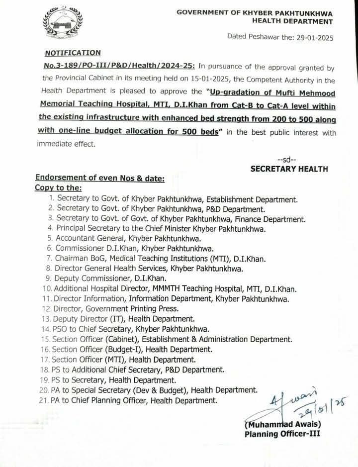 وزیر اعلی خیبر پختونخواہ علی امین گنڈاپور نے ڈی ایچ کیو ہسپتال اور مفتی محمود ہسپتال کو کیٹگری بی سے کیٹگری اے میں ترقی دینے کی اپرول جاری کردیا۔