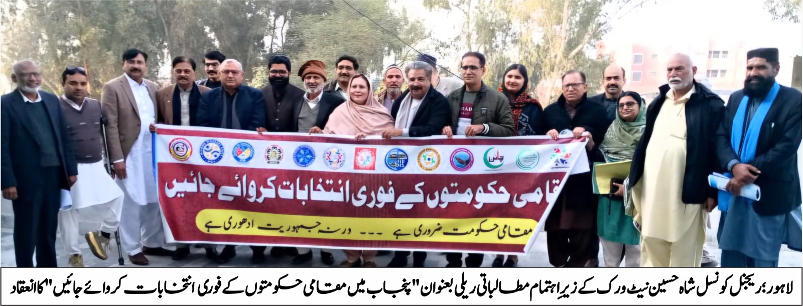 شاہ حسین ریجنل نیٹ ورک کی ممبر تنظیموں نے مقامی حکومتوں کے انتخابات کے لئے مطالباتی ریلی کا اہتمام کیا۔ جس کی قیادت ریجنل کنونیئر ڈاکٹر راشد محمود وڑائچ نے کی۔ اس موقع پر شرکائے ریلی کا کہنا تھا کہ پاکستان کے دیگر تینوں صوبوں میں مقامی حکومتیں نہ صرف قائم ہو چکی ہیں بلکہ منتخب نمائندوں کی قیادت میں مکمل طور پر فعال ہیں ہیں. لیکن بدقسمتی سے پنجاب میں مقامی حکومتی ادارے منتخب قیادت کی بجائے سرکاری مشینری کے ذریعے چلائے جا رہے ہیں۔ ملک میں منتخب مقامی حکومتوں کا قیام آئین پاکستان کے آرٹیکل 7، 32 اور 140A کے ذریعے آئینی ضرورت ہے۔ جب کہ صوبہ پنجاب کو گزشتہ کئی سالوں سے اپنے آئینی حق سے محروم رکھا جا رہا ہے۔ شرکاء کی طرف سے مزید کہا گیا کہ پنجاب حکومت کا ڈسٹرکٹ کوآرڈینشن کمیٹیوں کے ذریعے مقامی گوریننس قائم کر کے مقامی حکومتوں کے متبادل کے طور پر پیش کرنے کی کوششیں ناقابل قبول ہیں۔ مطالباتی ریلی میں مطالبہ کیا گیا کہ پنجاب حکومت مقامی حکومتوں کے قانون میں مناسب ترامیم سامنے لائے۔ جن میں اختیارات اور فرائض میں وسعت، نمائندگی کی شرح میں آبادی کے تناسب سے اضافہ اور مالیاتی خود مختاری کو یقینی بنانا شامل ہو۔ عوام کی براہ راست شراکت داری کو قانونی شکل دی جائے۔ انہوں نے کہا کہ مقامی ضروریات کی نشاندہی اور خدمات کی بنیادی سطح پر فراہمی ایسے کام ہو سکتے ہیں جو مقامی آبادی کی عملی شراکت سے بہتر نتائج دے سکیں۔ تاہم اس شراکت کو قانونی شکل میں تحفظ ضروری ہے۔ انہوں نے مطالبہ کیا کہ فوری طور پر قانون کی مطابق مقامی حکومتوں انتخابات کرائے جائیں۔ جب کہ مقامی حکومتوں کے حوالے سے کی جانے والی ترامیم اور قانون سازی سے پہلے لوکل گورننس پر کام کرنے والی تنظیموں اور مفادِ عامہ کی شہری تنظیموں سے بھی تجاویز لی جائیں۔