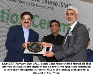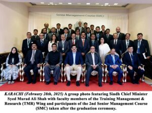 وزیر اعلیٰ سندھ سید مراد علی شاہ نے ٹریننگ مینجمنٹ اینڈ ریسرچ ( ٹی ایم آر) ونگ کے زیر اہتمام منعقدہ دوسرے سینئر مینجمنٹ کورس ( ایس ایم سی) کی گریجویشن تقریب میں شرکت کی۔ انہوں نے شرکاء کو اپنی تربیت کامیابی سے مکمل کرنے پر مبارکباد دی۔اپنے خطاب میں وزیر اعلیٰ نے گورننس میں پیشہ ورانہ مہارت کی اہمیت پر زور دیا۔ انہوں نے فارغ التحصیل افسران پر زور دیا کہ وہ اپنی قیادت میں دیانت داری، جوابدہی اور عوامی خدمت کو برقرار رکھیں۔مراد علی شاہ نے سندھ حکومت کے ادارے ٹریننگ مینجمنٹ اینڈ ریسرچ ونگ کو محدود وسائل کے باوجود کورس کے انعقاد پر سراہا۔ انہوں نے مڈ کیریئر مینجمنٹ کورس اور سینئر مینجمنٹ کورس کے ذریعے صوبائی سول سروس کی استعداد کار کو مضبوط بنانے میں ونگ کے اہم کردار کو تسلیم کیا۔یہ بات قابل ذکر ہے کہ ٹریننگ مینجمنٹ اینڈ ریسرچ ونگ نے صوبائی کیڈر سروس کے افسران کے لیے سینئر مینجمنٹ کورس کی تربیت کا انعقاد کیا۔ اس چار ماہ کے کورس میں سابق پاکستان سول سروس کے 17 اور پروونشل سیکریٹریٹ سروس کے 10 افسران شامل تھے۔ اس تربیت کا مقصد کیریئر کی بہتری اور گریڈ 20 میں ترقی کے مواقع فراہم کرنا ہے۔جدید گورننس کے چیلنجز پر روشنی ڈالتے ہوئے وزیر اعلیٰ نے سول سرونٹس میں اسٹریٹجک سوچ، جدت اور وسائل کے مؤثر انتظام کی ضرورت پر زور دیا۔ انہوں نے امید ظاہر کی کہ فارغ التحصیل افسران اپنی تربیت کو سندھ کے عوام کی خدمت میں مؤثر طریقے سے بروئے کار لائیں گے۔