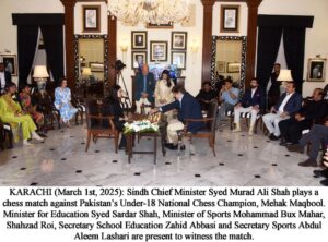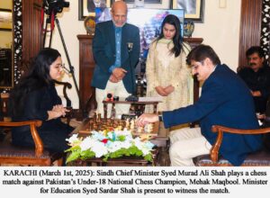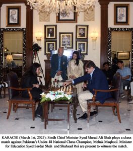 وزیراعلیٰ سندھ نے پاکستان کی انڈر 18 قومی شطرنج چیمپئن مہک مقبول سے وزیراعلیٰ ہائوس میں ایک دلچسپ اور متاثر کن شطرنج کاکھیل کھیلا۔ مہک مقبول حال ہی میں شطرنج فیڈریشن آف پاکستان کے زیر اہتمام نیشنل یوتھ چیس چیمپئن شپ میں ٹائٹل یافتہ کھلاڑی ہیں ۔مہک مقبول نے بہت ہی کم چالوں میں وزیراعلیٰ سندھ کو چیک میٹ کیا اور میچ جیت لیا جبکہ وزیراعلیٰ سندھ نے بھی کافی جرأت مندانہ کھیل کا مظاہرہ کیا۔ وزیراعلیٰ سندھ نے ہر جیتنے والے کے لیے 1 لاکھ روپے کا اعلان کیا، جن میں مہک مقبول جوکہ انڈر 18 کیٹیگری میں فرسٹ پوزیشن (ایس ایم بی فاطمہ جناح گورنمنٹ اسکول، زندگی ٹرسٹ کے زیرانتظام)، یمنہ صدیقی – انڈر 14 کیٹیگری میں دوسری پوزیشن(گورنمنٹ ایس ایم بی فاطمہ جناح اسکول) اور علینا صدیقی جوکہ انڈر12 کیٹیگری میں تیسری پوزیشن (گورنمنٹ ایس ایم بی فاطمہ جناح اسکول) شامل ہیں۔ ریا منجی انڈر 10 کیٹیگری میں اور محمد عیسیٰ حسین انڈر 8 اور 9 کیٹیگری میں سیویتا اسکول کی طرف سے حصہ لیا۔ ان چیمپئن کا تعلق کراچی سندھ سے ہے۔