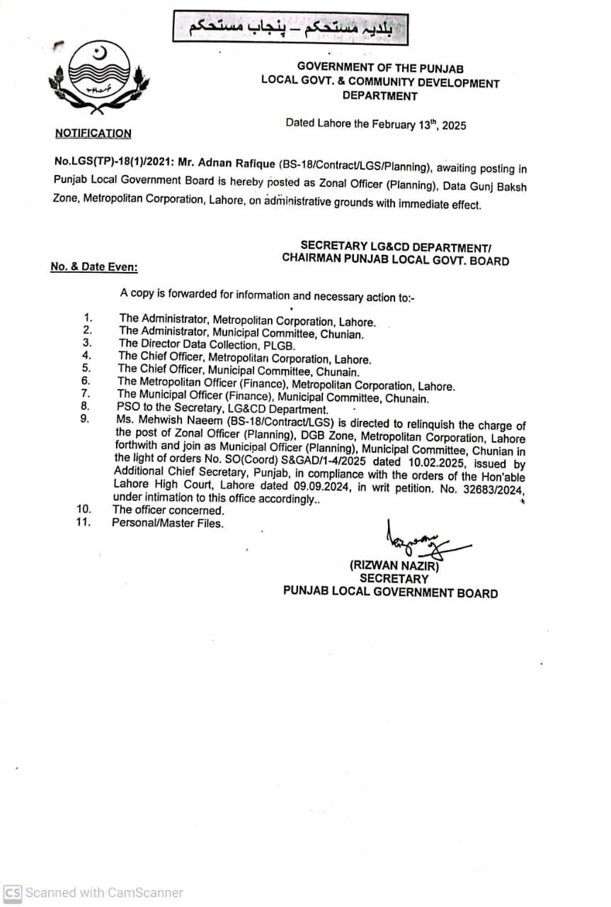 محکمہ بلدیات پنجاب نے تقرری کے منتظر ٹاؤن پلاننگ فنکشنل یونٹ لوکل گورنمنٹ سروس گریڈ 18 کے عدنان رفیق کو زونل آفیسر پلاننگ داتا گنج بخش زون میٹروپولیٹن کارپوریشن لاہور تعینات کردیا ہے۔وہ لوکل گورنمنٹ بورڈ تقرری کے منتظر تھے۔داتا گنج بخش زون سے زونل آفیسر پلاننگ مہوش نعیم کا ایم او پلاننگ میونسپل کمیٹی چونیاں تبادلہ کیا گیا ہے۔