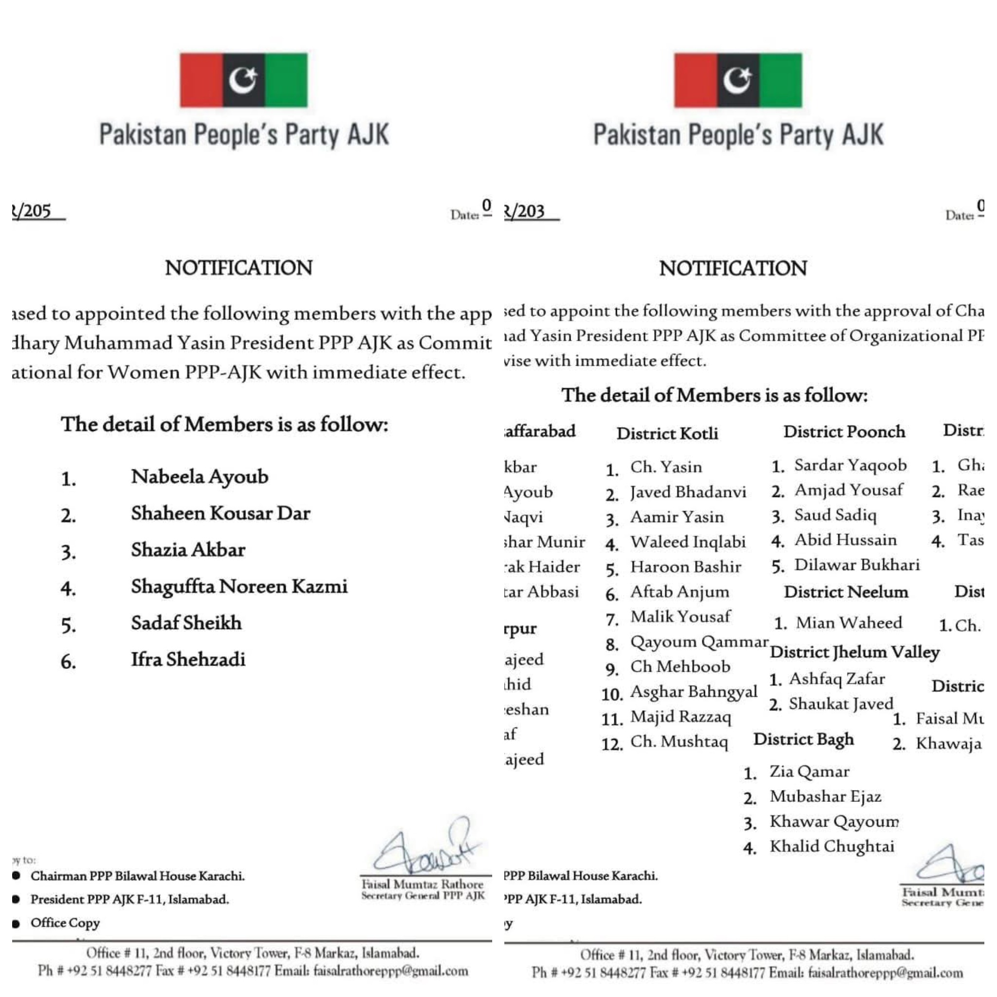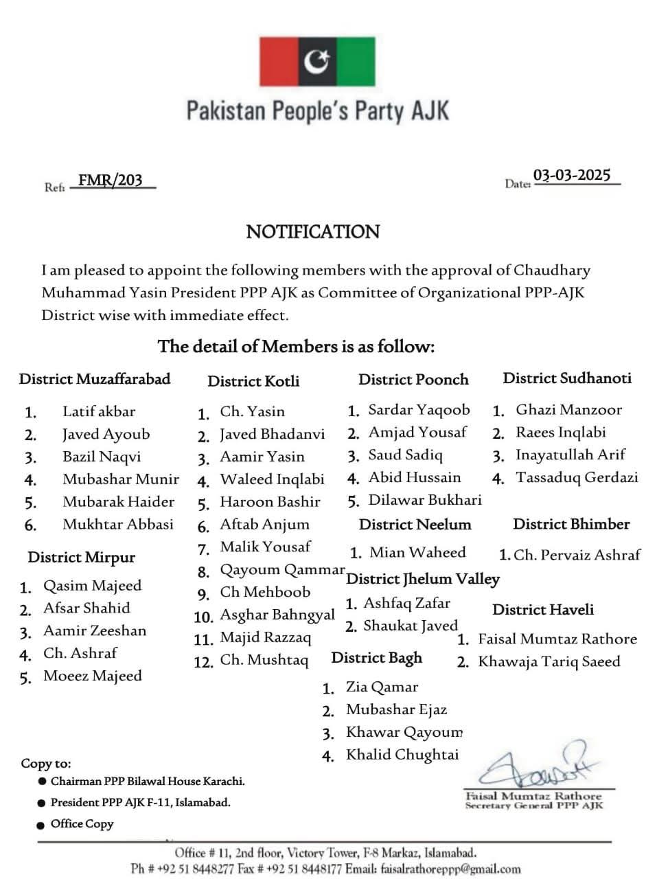 وزیر بلدیات آزاد جموں و کشمیر فیصل ممتاز راٹھور نے کہا ہے کہ پاکستان پیپلزپارٹی آزاد کشمیر کی تنظیم نو کیلئے آرگنائزنگ کمیٹیز کے قیام اور ناموں کا فیصلہ پارٹی کے کراچی اجلاس میں ہوا تھا۔ اجلاس میں طے ہوا تھا کہ ایم ایل ایز اور ٹکٹ ہولڈرز ہی ممبرز ہونگے باغ سے سردار قمرالزمان خان نے خود اور سردار ضیاء القمر دونوں کے بجائے اپنی جگہ دیگر نامزدگی کی تجویز دی جس پر مبشر اعجاز خان ممبر بنے اور مظفرآباد شہر کے حلقہ میں اختلاف رائے کو مدنظر رکھتے ہوئے دو ممبرز لیے گئے میری ذاتی خواہش تھی کہ حویلی سے خواجہ طارق سعید ممبر ہوں لیکن پالیسی کے تحت مجھے ممبر بننا پڑا البتہ میں نے عمومی رائے کے پیش نظر انہیں کمیٹی میں شامل کرنے کی تحریک کی ہے وہ بھی ممبر ہونگے جہاں تک خواتین کی عدم شمولیت کا تعلق ہے تو خواتین ونگ کی الگ سے تنظیم سازی ہونا ہے جس کیلیے الگ خواتین پر مشتمل کمیٹی بنائی گئی ہے۔