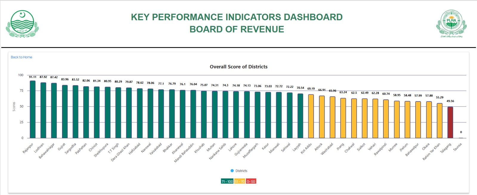 بورڈ آف ریونیو پنجاب کی جانب سے پنجاب بھر کے ڈپٹی کمشنرز کی جنوری کی کارکردگی رپورٹ جاری کر دی گئی ہے۔ جس کے مطابق ڈپٹی کمشنر راجن پور پنجاب میں سب سے پہلی پوزیشن پر آ گئے ہیں۔ڈپٹی کمشنر لاہور 20 ویں نمبر پر جبکہ ڈی سی تلہ گنگ کی کارکردگی سب سے ناقص نکلی۔