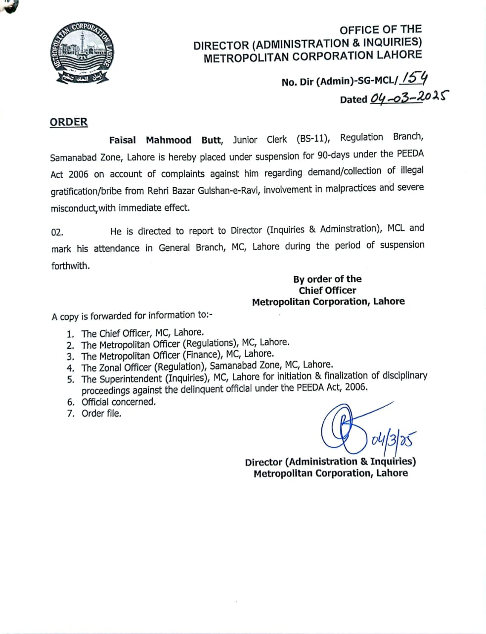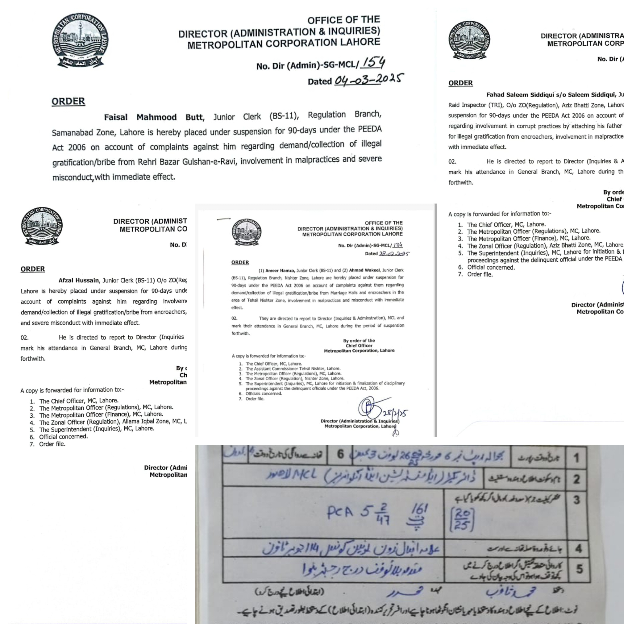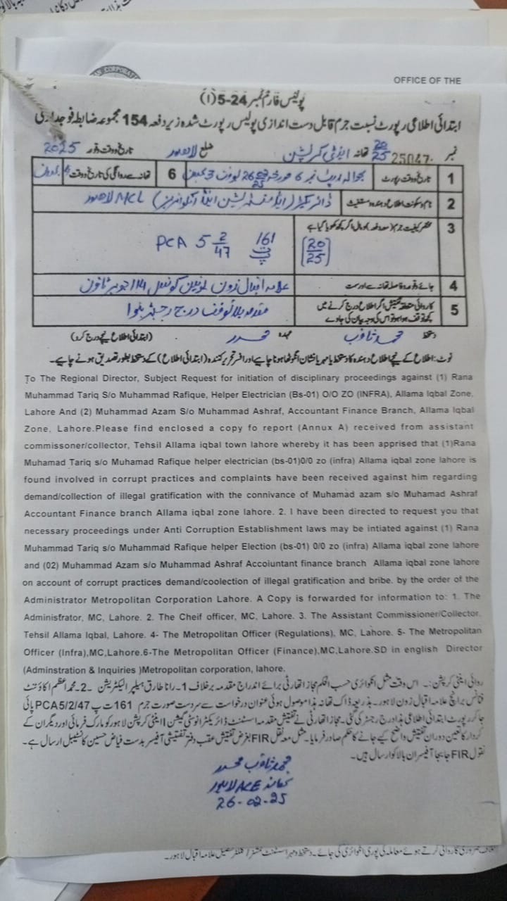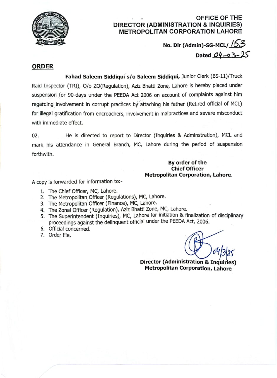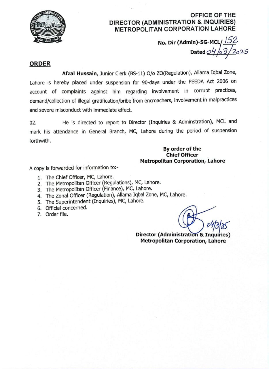 بلدیہ عظمٰی لاہور شعبہ ریگولیشن کے بڑی تعداد میں ملازمین معطل،پیڈا ایکٹ کے تحت انکوائریز اور کیس اینٹی کرپشن کے سپرد،پٹواری راج