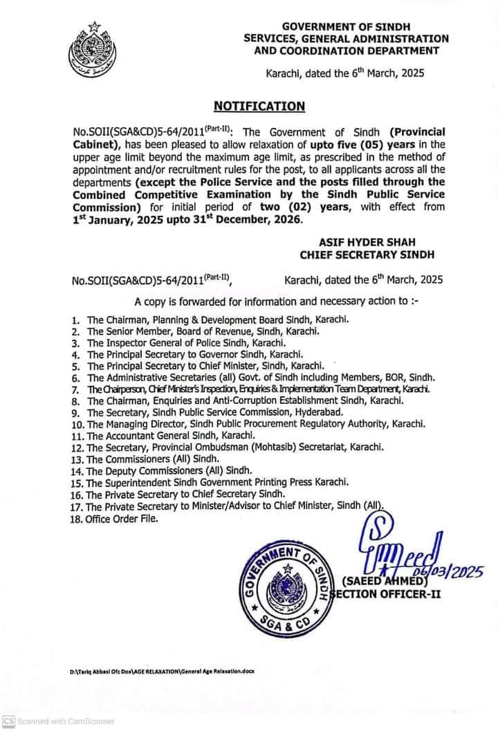 سندھ حکومت نے سرکاری محکموں میں نوکریوں کے لیے عمر کی حد 5 سال تک بڑھا دی ہے، نوٹیفکیشن کا اطلاق 31 دسمبر 2026 تک رہے گا۔ چیف سیکرٹری سندھ آصف حیدر شاہ کی جانب سے باقاعدہ نوٹیفکیشن جاری کر دیا گیا ہے۔جو صوبائی کابینہ کے فیصلے کی روشنی میں جاری کیا گیا ہے۔