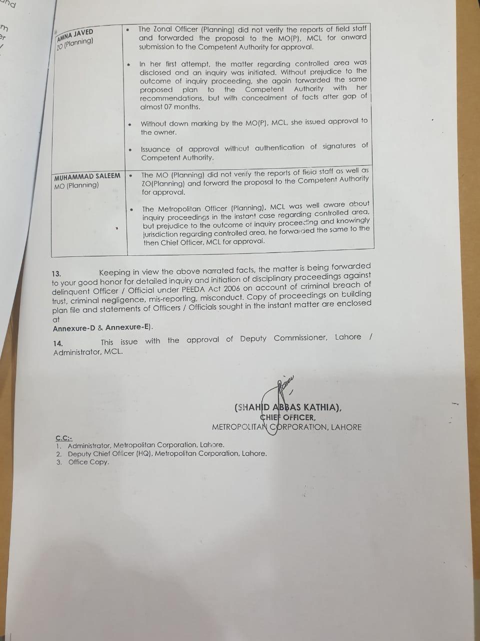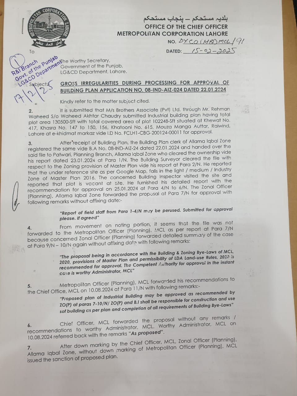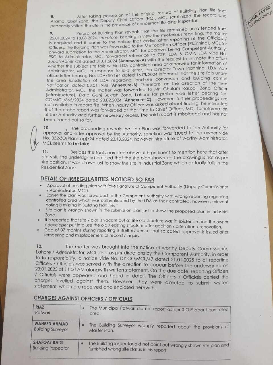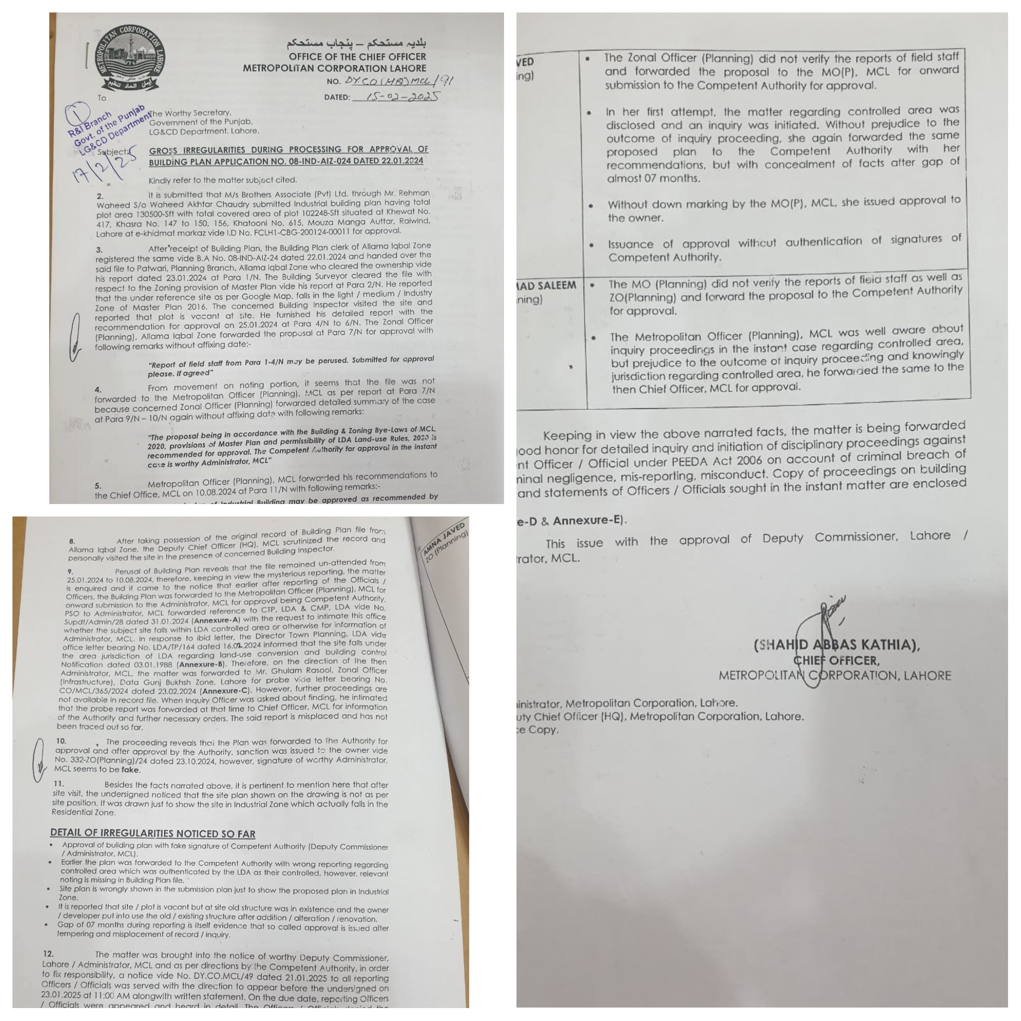 بلدیہ عظمٰی لاہور کے سابق چیف آفیسر اور موجودہ چیف آفیسر میونسپل کارپوریشن فیصل آباد سید علی عباس بخاری نے کہا ہے کہ میسرز برادرز ایسوسی ایٹ پرائیویٹ لمیٹڈ کے صنعتی نقشے میں ان کا کوئی عمل دخل نہیں۔ایم سی ایل کی طرف سے کی گئی انکوائری رپورٹ میں بھی ان کے خلاف کوئی شواہد نہیں ملے۔