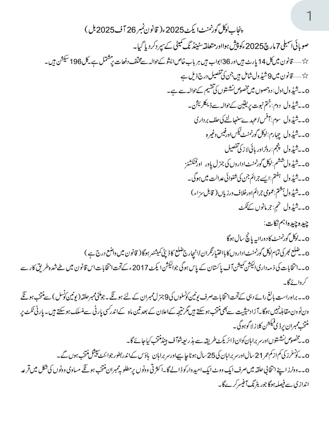 صوبائی اسمبلی 7 مارچ 2025ء کو پیش ہوا اور متعلقہ سٹینڈنگ کمیٹی کے سپرد کر دیا گیا۔قانون میں کل 14 پارٹ ہیں اور 36 ابواب ہیں ہر باب خاص ایشو کے حوالہ سے مختلف دفعات پر مشتمل ہے ۔ کل 196 سیکشن ہیں۔قانون میں 9 شیڈول شامل ہیں جن کی تفصیل درج ذیل ہے ۔ ۔ شیڈول اول: دو حصوں میں مخصوص نشستوں کی تقسیم کے حوالہ سے ہے۔ – شیڈول دوم ختم نبوت پر یقین کے حوالہ سے ڈیکلریشن۔- شیڈول سوم: آفس / عہدے سنبھالنے کی حلف برداریہ۔ ۔ شیڈول چہارم : لوکل گورنمنٹ ٹیکس اور فیس وغیرہ۔۔ شیڈول پنجم : رولز اور بائی لاز کی تفصیل